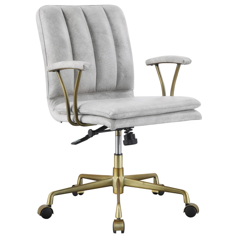 Furnish your office with the Damir high back office chair. This rolling swivel chair has fully adjustable lift height with exceptional lumbar support, and features luxurious top grain upholstery in vintage white with decorative vertical stitching, all beautifully accented by chrome-accented arms and base.