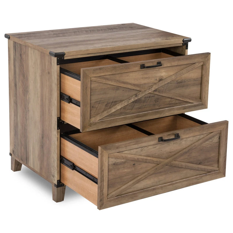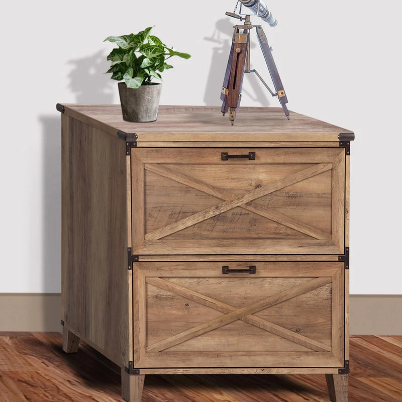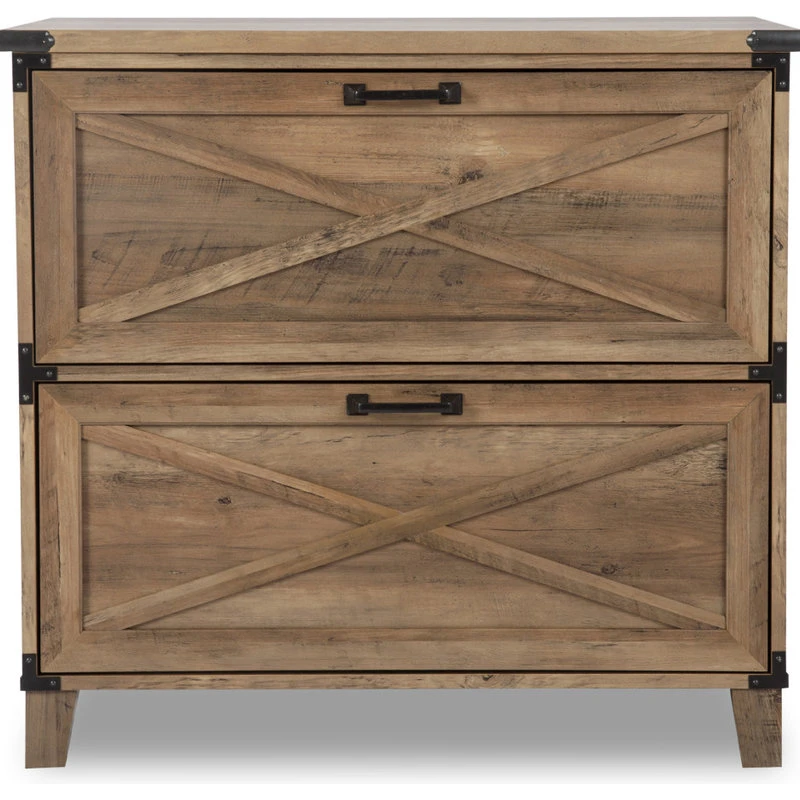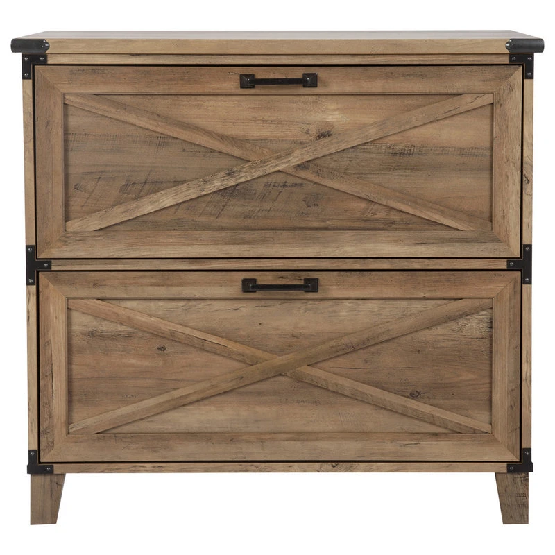 File away your important papers and documents in this beautiful rustic file cabinet. It blends in so well within a casually stylish setting, no one will guess that it’s diligently functioning as an efficient organizational tool within your office, bedroom, or wherever you do your work at home. Visually appealing accents like black steel hardware and X-cross detailing on the cabinet fronts keep the industrial vibe strong. The cabinet includes a file hanging bar for convenience.