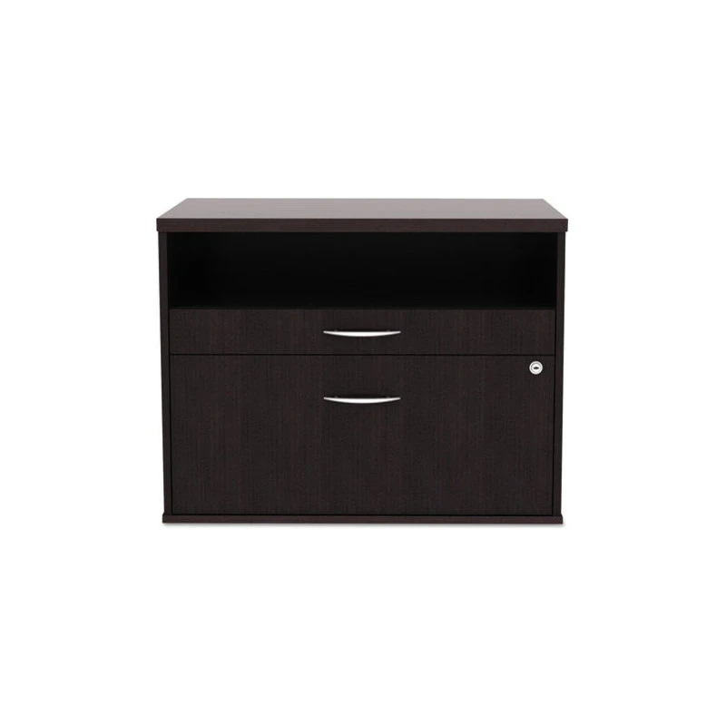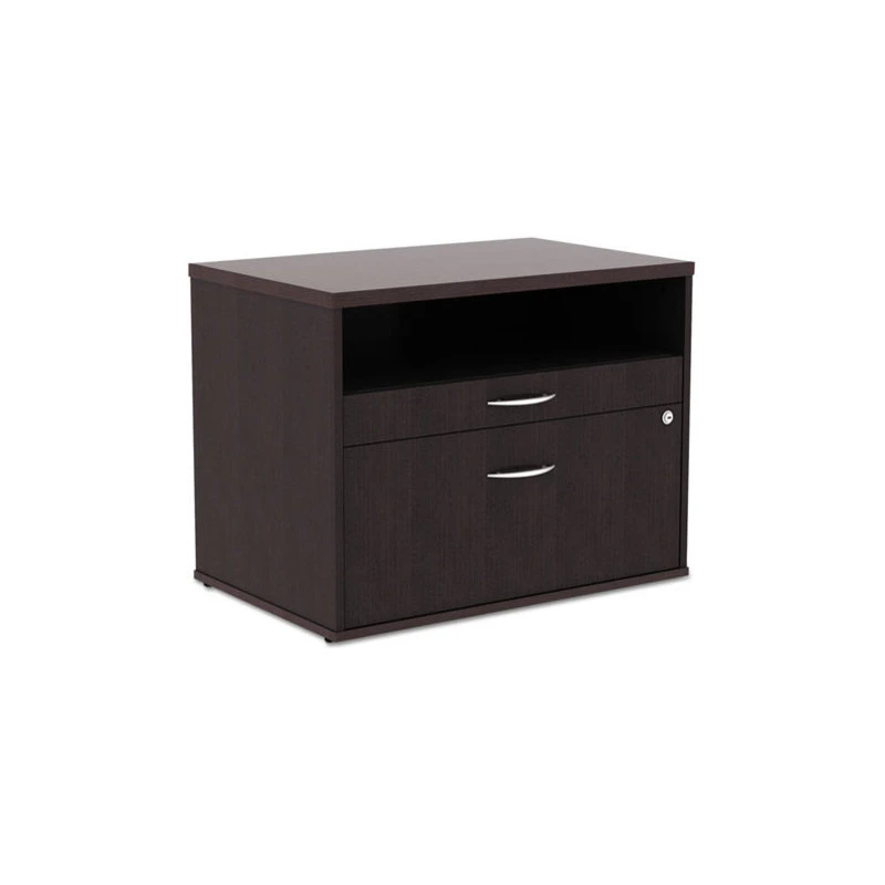 Sturdy low file cabinet great for use for storage or as a low credenza with your desk. Great used as a return to expand your desk space to create L or U shaped desk configurations. Coordinating laminates for use with Alera Valencia, Sedina, or Open Office Desk Series. Three storage spaces including lateral file drawer, pencil drawer and open storage. Full extension ball-bearing slides for easy access to everything. Configurable left or right handed. Durable woodgrain laminate is scratch-, dent-, and water-resistant. Leveling glides compensate for uneven floors. Two fold-away safety keys. Accommodates letter or legal filing.