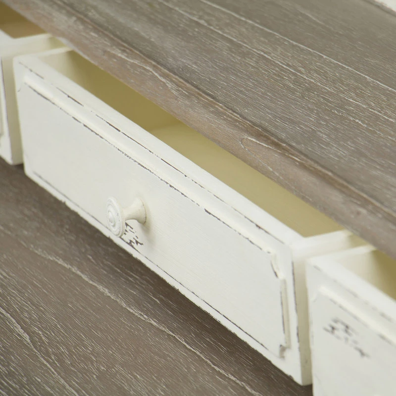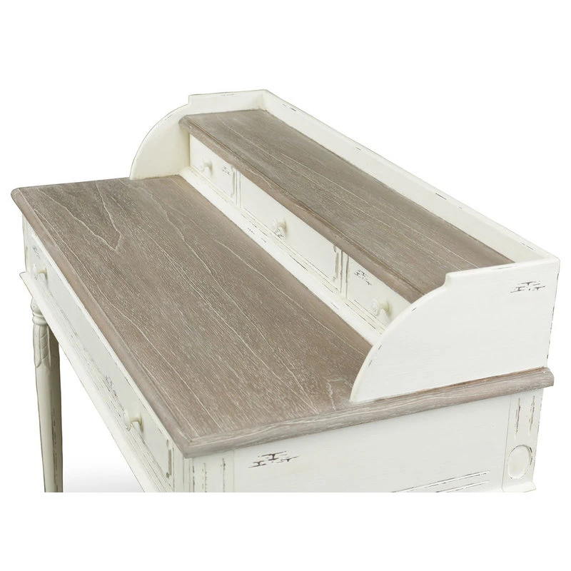 Boasting a white-streaked and distressed finish plus plenty of storage space via four drawers and a well-positioned shelf, our Anjou Traditional French Accent Writing Desk combines flair and utility. The genuine mindi-wood tops feature a white-streaked natural veneer that pairs perfectly with the distressed white finishing that comprises the remainder of this writing desk. The wooden drawer handles maintain the stylistic stance to perfection.
