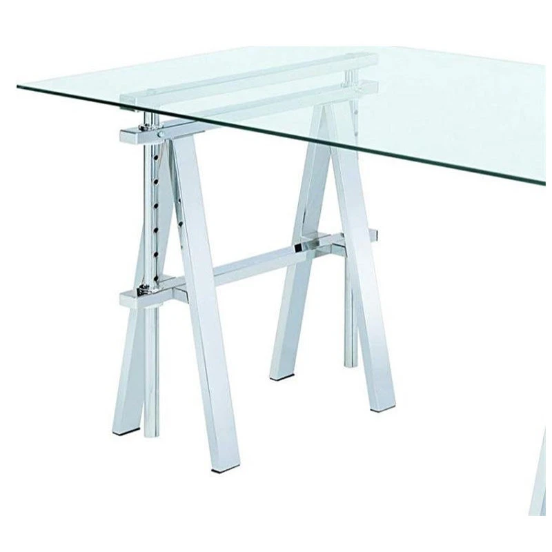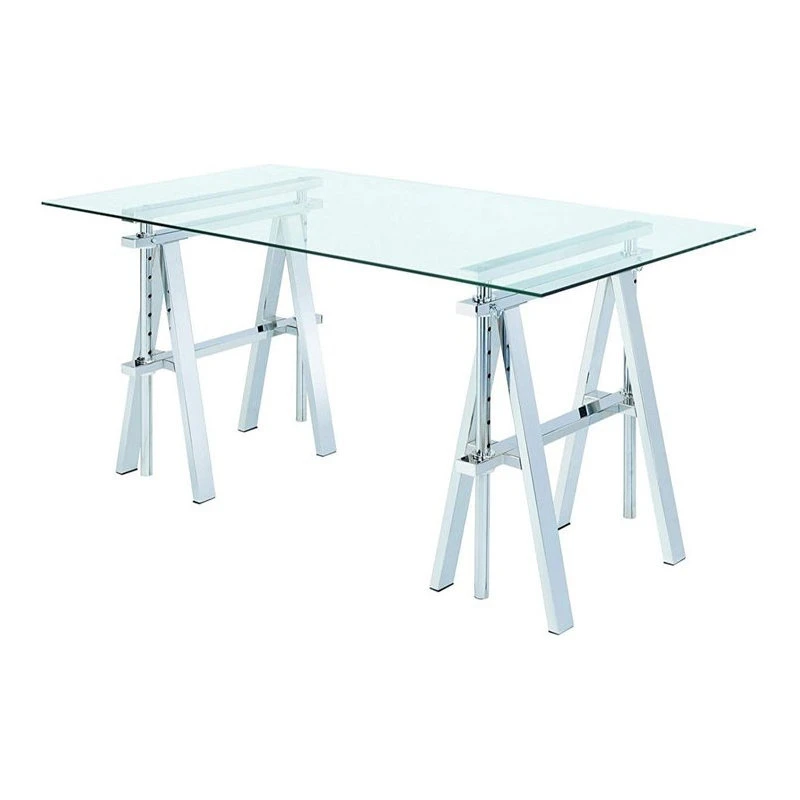 Your eyes will not know where to look with this sawhorse style chrome colored desk. It features a clear tempered glass tabletop and is capable of adjusting height in 2 inch segments. Built while keeping in mind the sleek lines of the decor, it is meant to provide that extra oomph to your furnishings and convert your home or office space into a dream.