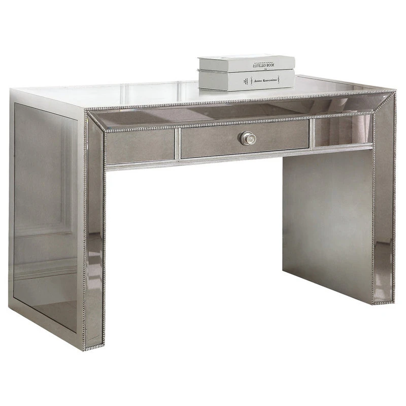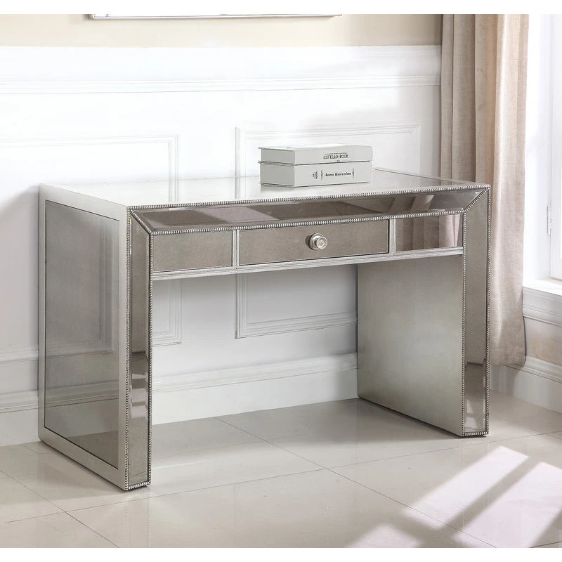 Add a glamour look to your bedroom or office with this Jameson collection writing desk. Made of solid wood with all mirrored panel, this desk will turn your home to look more contemporary. It includes 1 drawer with black interior. The side rails are metal and the top desk is also mirrored. The trimming of the desk is also distressed to give it a special look.