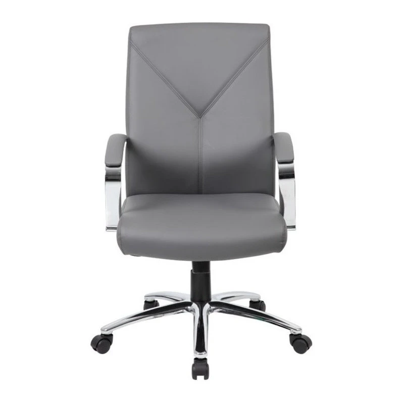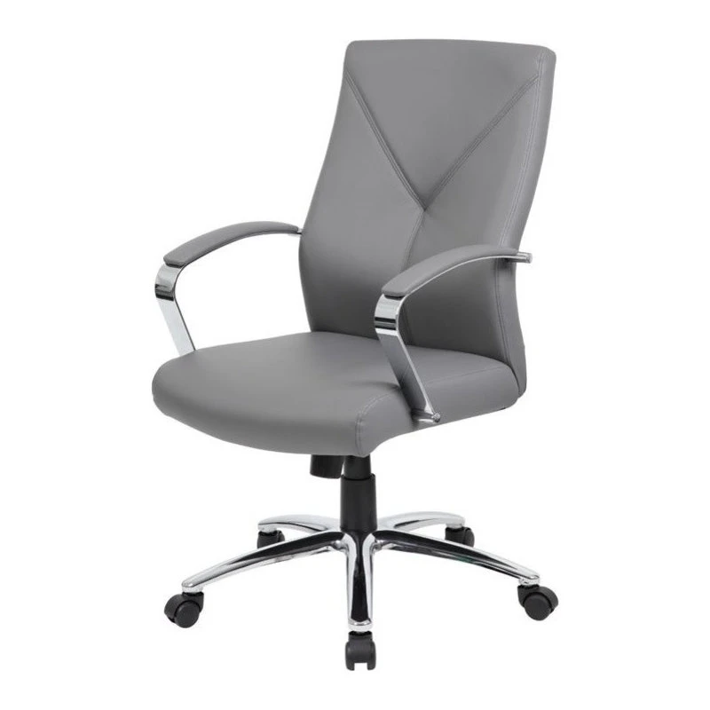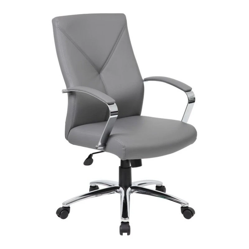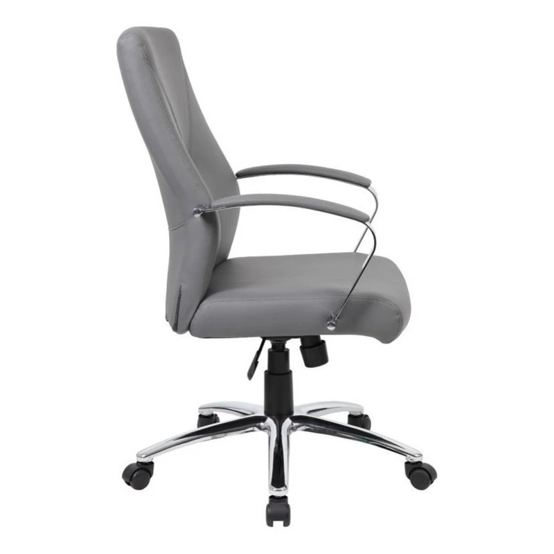 Beautifully upholstered in Gray LeatherPlus. LeatherPlus is leather and polyurethane for added softness and durability. Metal chrome plated arms topped with soft arm pads. Upright locking position. Pneumatic gas lift seat height adjustment. Adjustable tilt tension control. Large 27″ chrome base. Hooded double wheel casters.