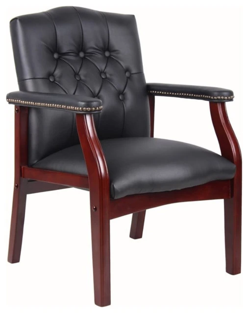 This Boss Traditional Black Caressoft Guest Chair boasts elegantly upholstered black Caressoft vinyl cushions with a mahogany finished wooden base. This guest chair features a seat measuring 20″ W x 19″ D with a seat height of 18 inches. The overall size of the chair measures 24.5″ W x 27″ D x 35.5″ H, offering a seating solution that can accommodate in most rooms. With quality manufacturing and a weight capacity of 250 pounds, the Boss Traditional Black Caressoft Guest Chair provides comfort and style in a home for many years.