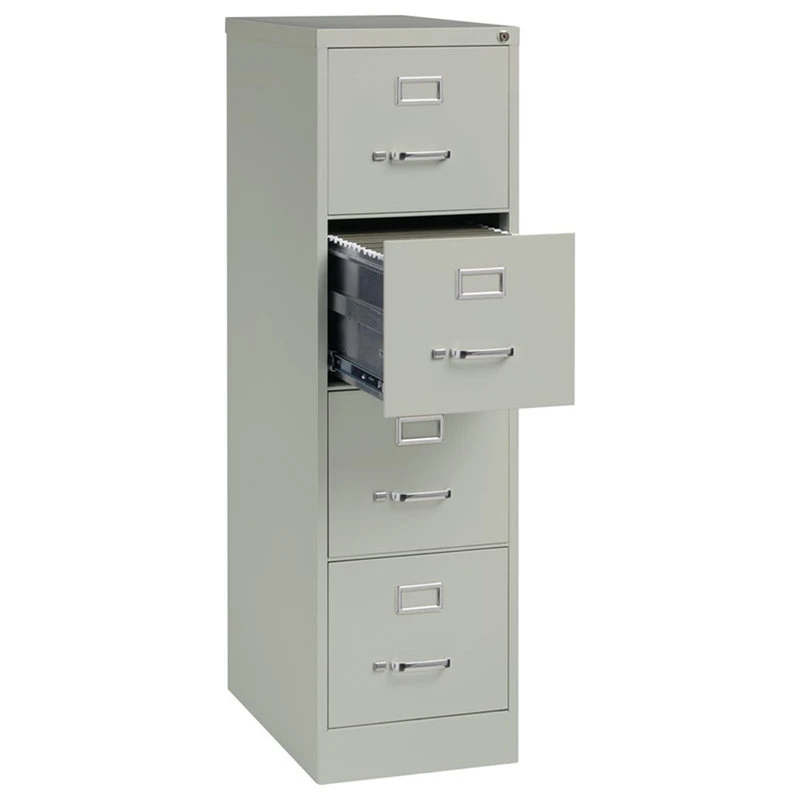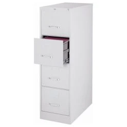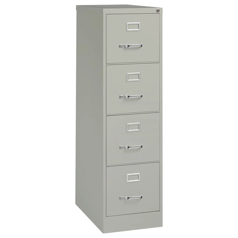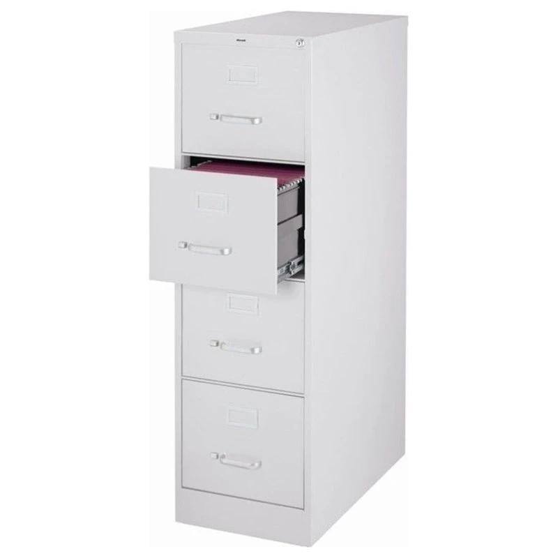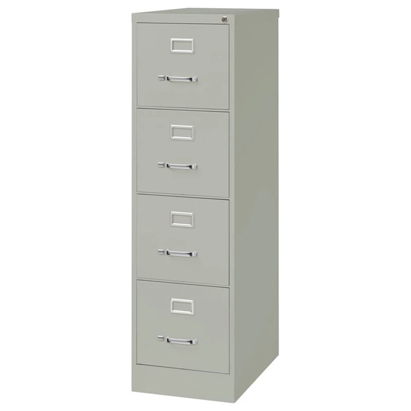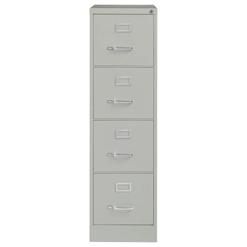 Bowery Hill 25-inch deep metal four-drawer, letter width, commercial grade vertical file cabinets in light gray are perfect for business, educational, or personal offices. These cabinets feature a classic design and are constructed with high quality durable materials that are suitable for heavy-duty use. Ships fully assembled and is ready to accept letter width hanging file folders. Non-porous surface is easy to clean and disinfect. Each drawer includes full extension ball-bearing slides for smooth drawer action. Even fully loaded, these drawers open with ease. Adjustable follower blocks keep files upright. The aluminum handles and label holder are durable and functional making it easy to access and label drawer contents. The included core-removable lock allows cabinets to be keyed alike. Designed to meet or exceed ANSI/BIFMA industry standards for performance and workmanship. Made with 28% total recycled content. Backed by a Limited Lifetime Warranty. TAA Compliant. Greenguard Gold certified for indoor air quality.