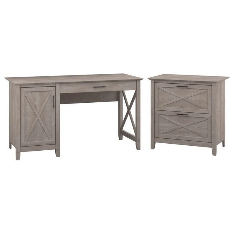 The Bush Furniture Key West 54W Computer Desk with 2 Drawer Lateral File Cabinet offers a refreshing array of furniture components. A keyboard drawer with flip down front features full extension ball bearing slides. Storage cabinet has one adjustable shelf and includes wire management for easy access to cords. This collection offers the look of natural reclaimed wood with a Washed Gray finish and Aged Bronze hardware. Its cottage style includes a unique X pattern accent on the Desk side panel and cabinet door for a relaxed feel blended with an attractive post leg design. This accent carries over to the Lateral File Cabinet drawer panels complemented with Aged Bronze handles. Enjoy full extension ball bearing slides on the two file drawers for easy access to your letter or legal size folders. Meets ANSI/SOHO standards for safety and performance and backed by a 1 Year Warranty.