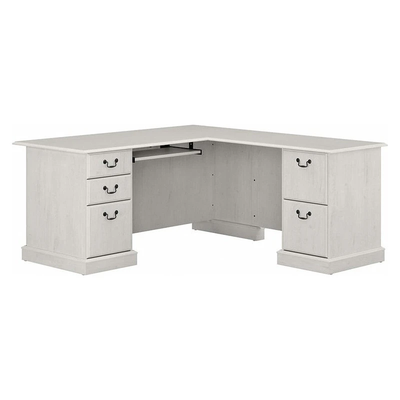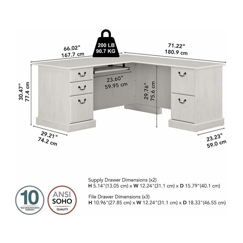 The Bush Furniture Saratoga L Shaped Computer Desk with Drawers presents a practical, durable workspace that reflects the refined elegance of timeless traditional styling. Whether you’re working on an important project, paying bills or just surfing the web, the spacious 66W x 72D desktop offers more than enough room to spread out while supporting up to 200 pounds. Take advantage of three file drawers that open on smooth ball bearing slides to organize your letter, legal and A4-size paperwork. Store small office supplies inside two box drawers and use the retractable keyboard tray/laptop storage shelf to keep the work surface free from clutter. The L Desk can be assembled in a right or left-handed configuration and looks great facing any direction. This L Shaped Desk with Storage has been tested to meet ANSI/BIFMA standards for safety and performance and is backed by a 10 Year Warranty.