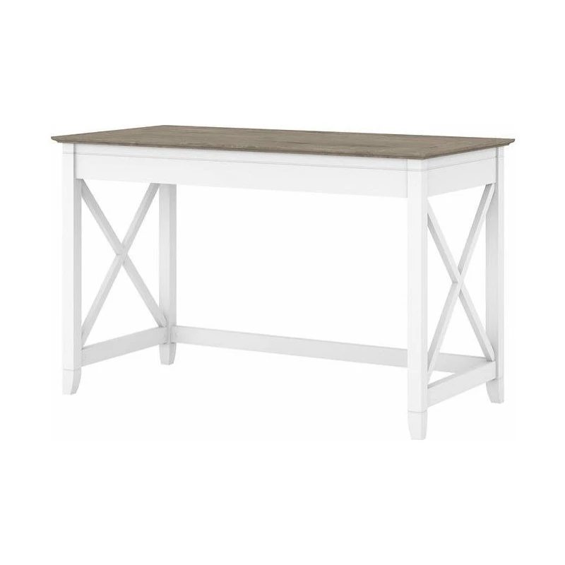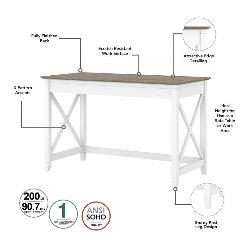 Take on your daily tasks from the comfort of a spacious personal work area, even in small office environments. The Bush Furniture Key West 48W Writing Desk offers more than enough room to spread out with a laptop and paperwork as you surf the web, pay bills or check the mail. Featuring side panels with unique X pattern accents, this office desk creates a relaxed and airy style supported by a sturdy and attractive post leg design. The durable work surface has a weight capacity of 200 pounds so you can confidently keep books and other work materials close by. Measuring 48W x 24D x 30H, the Writing Desk is perfect for use as a sofa table, console table or personal work area and is finished on all sides to look great facing any direction. This small computer desk is tested to meet ANSI/SOHO quality standards for safety and performance and is backed by the Bush Furniture 1 Year Warranty.