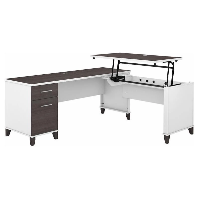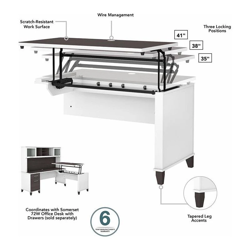 Upgrade your personal workspace with the ergonomic Bush Furniture Somerset 72W 3 Position Sit to Stand L Shaped Desk. As a quality alternative to desktop risers, the innovative 42W x 24D Sit to Stand Return offers all the health benefits of a standing desk with the versatility of more expensive electric height adjustable options. The built-in mechanical Lift-n-Lock system allows the desktop to lock into place at standing heights of 35, 38, and 41 inches and easily returns to a seated position. The 72W x 24D Office Desk includes a file drawer that opens on full-extension ball bearing slides for easy access to legal and letter size documents in addition to a box drawer for supplies and utensils. Fixed surfaces are tested to meet ANSI/SOHO standards for safety and performance while the mechanical lift is rigorously tested to Bush Furniture quality standards. Backed by a 6 Year Warranty.