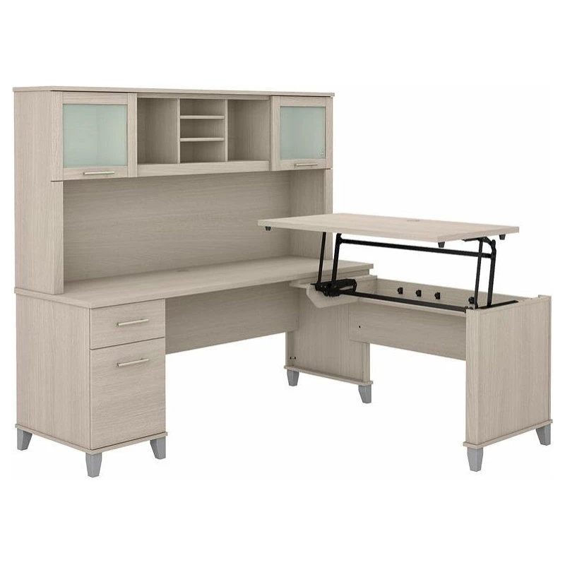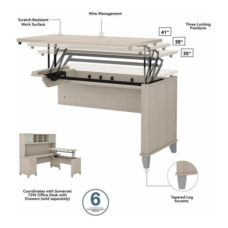 The Bush Furniture Somerset 72W 3 Position Sit to Stand L Shaped Desk with Hutch offers an ideal solution for those seeking a stylish and functional ergonomic workspace. The built-in mechanical Lift-n-Lock system allows the 42W x 24D Return to lock into place at standing heights of 35, 38, and 41 inches and easily returns to a seated position. The 72W x 24D Office Desk includes a file drawer that opens on smooth full-extension ball bearing slides for easy access to legal and letter size documents in addition to a box drawer for supplies and utensils. The Hutch attaches to the desktop and adds two frosted glass doors for concealed storage in addition to open cubby spaces with two shelves. Fixed surfaces are tested to meet ANSI/SOHO standards for safety and performance while the mechanical lift is rigorously tested to Bush Furniture quality standards. Backed by a 6 Year Warranty.