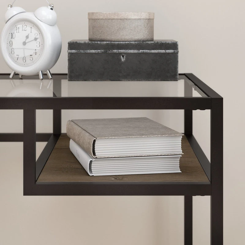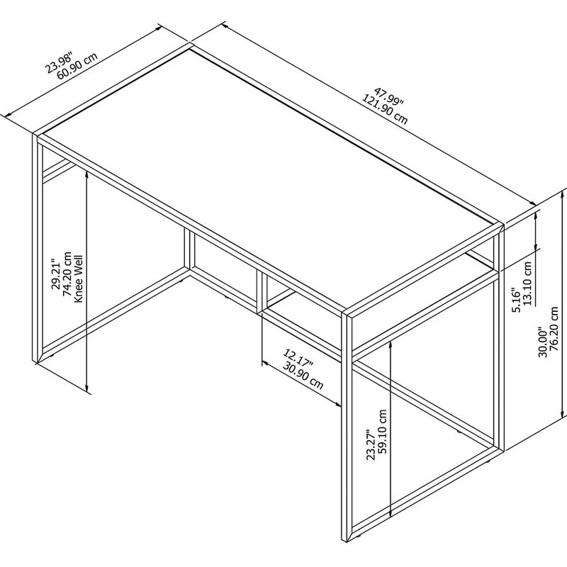 By combining a trio of distinct materials into an industrial modern design, the Bush Furniture Anthropology 48W Glass Top Writing Desk offers a unique workspace solution that’s equal parts style, function and durability. A floating shelf sits beneath the glass surface to keep office supplies and work-in-progress close by while still allowing for plenty of leg room. An ideal choice for working in compact areas, the versatile 48W x 24D x 30H Desk design can also serve as a sofa table, console table or entryway table and is finished on all sides to look great facing any direction. Sturdy metal framework supports the glass desktop for a weight capacity of 150 pounds and provides a perfect complement to the shelf’s Rustic Brown finish for an on-trend reclaimed appearance. This glass computer desk with storage is tested to meet ANSI/SOHO quality standards for safety and performance and is backed by the Bush Furniture 1 Year Manufacturer’s Warranty. See the Anthropology Collection’s full range of home furnishings to expand your living space with modern industrial style.