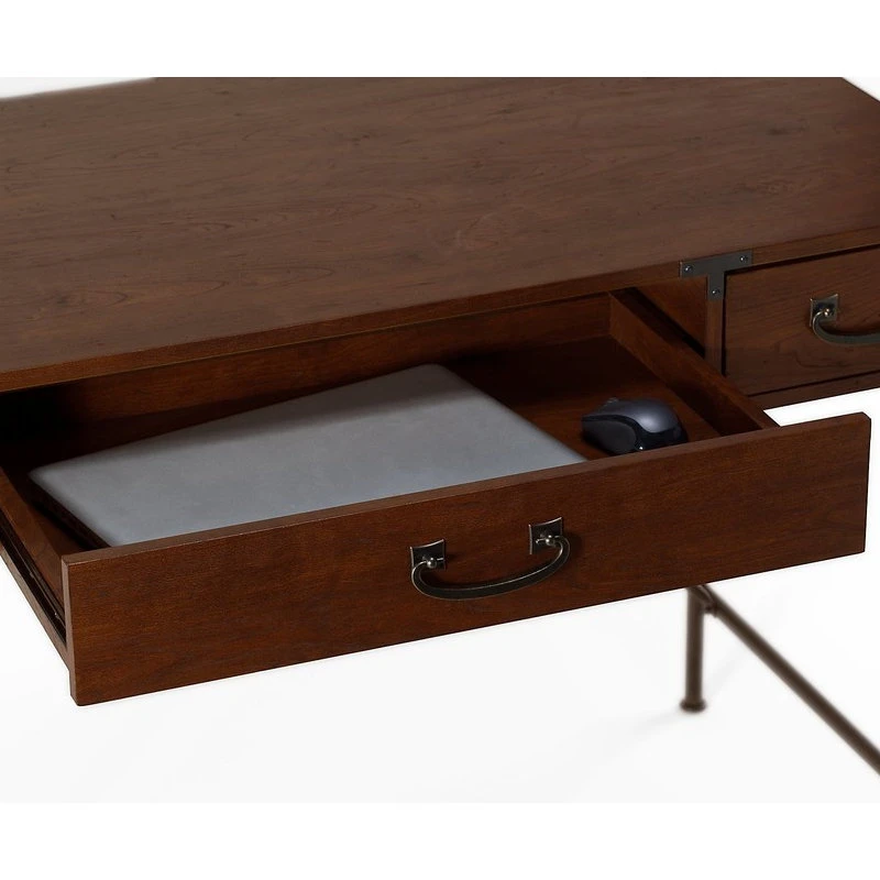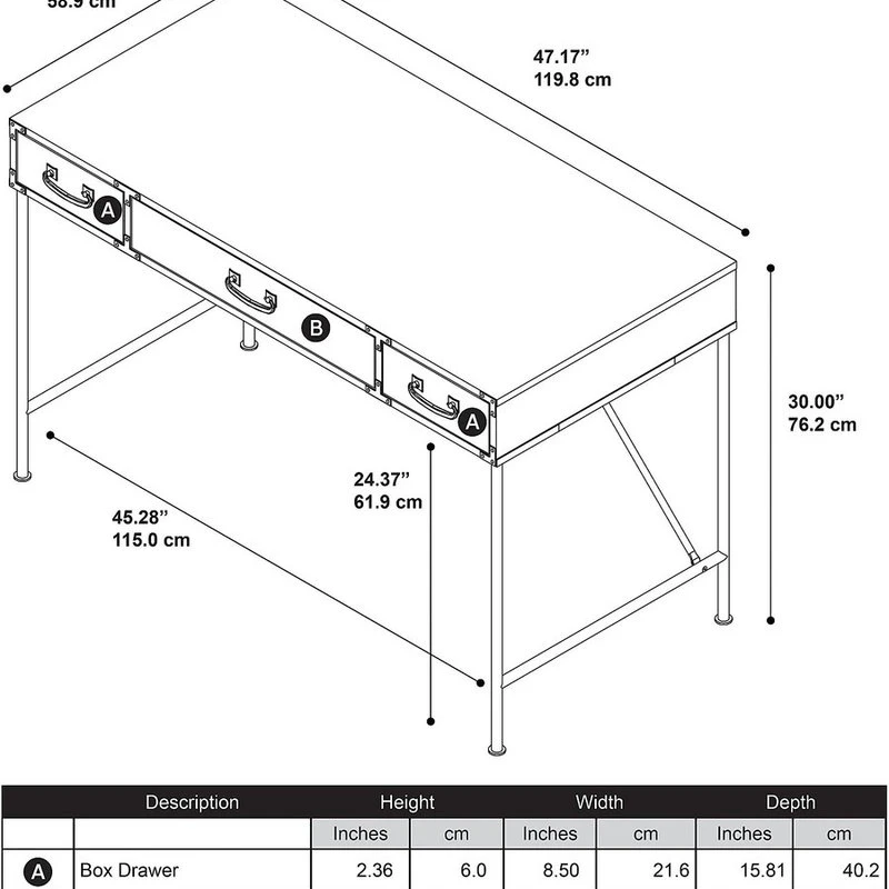 The kathy ireland Office by Bush Furniture Ironworks 48W Writing Desk offers incredible durability and unique detailing popular in today’s family homes. This collection blends a variety of styles from rustic to modern, while capturing industrial era details with exposed steel legs, Aged Bronze accents and metal pulls. The welded powder coated base provides strength while supporting the durable laminate work surface for day-to-day use. Functional center drawer provides a drop down front which is ideal for keyboard or laptop storage. Complete with two convenient box drawers which are perfect for office supplies. Construction meets ANSI/SOHO furniture standards for strength and durability for affordable home furnishings backed by a 3 Year Manufacturer’s Warranty. And for a total office solution, see the full Collection for coordinating items available.