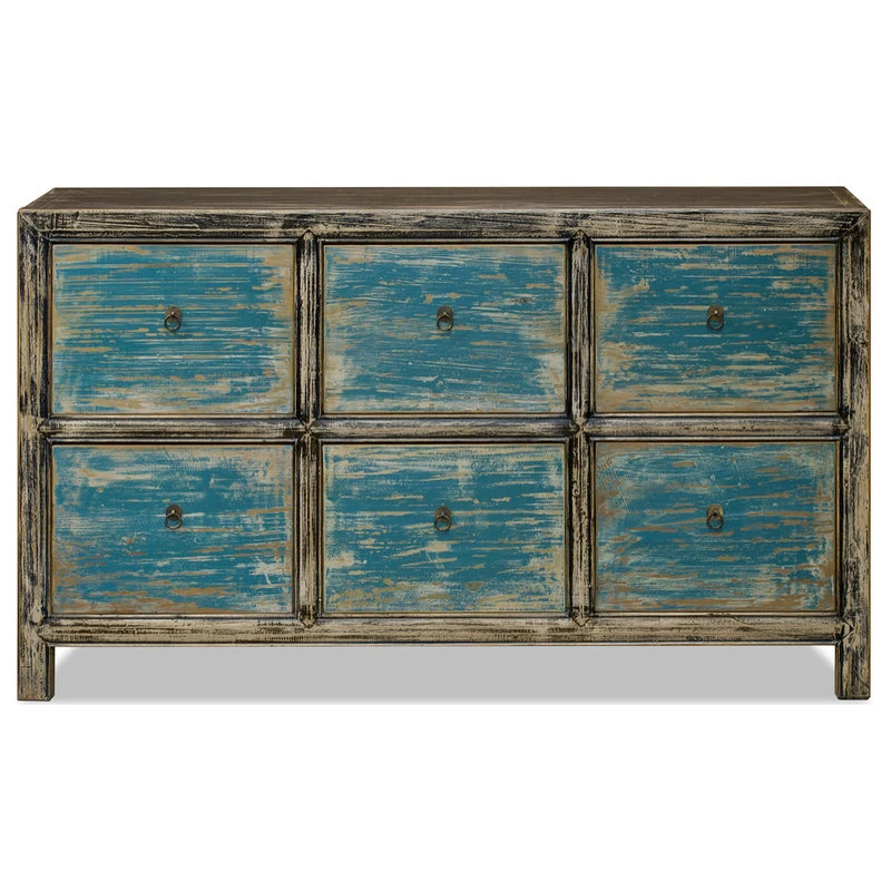 Exquisitely simple yet impactful, this rustic file cabinet was hand crafted of Elmwood by artisans in China. Each drawer is equipped with a hand-forged Ming brass pull. Meticulously hand-applied distressed blue finish helps refine this cabinet’s homey yet curious feel. Fully assembled. (Hanging frames not included).