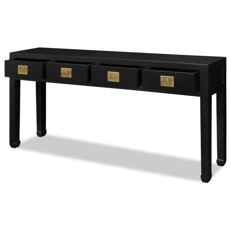 Simple and sleek, our Elmwood Ming console table perfectly suits a hallway or behind a sofa in the contemporary living room. Four drawers provide ample storage space. Hand rubbed matte black finish is emphasized by its brass hardware. Fully assembled.