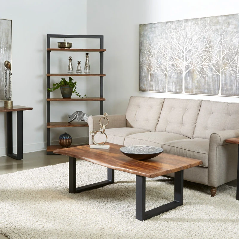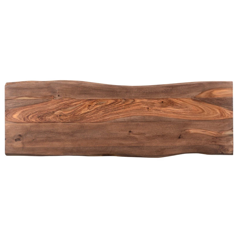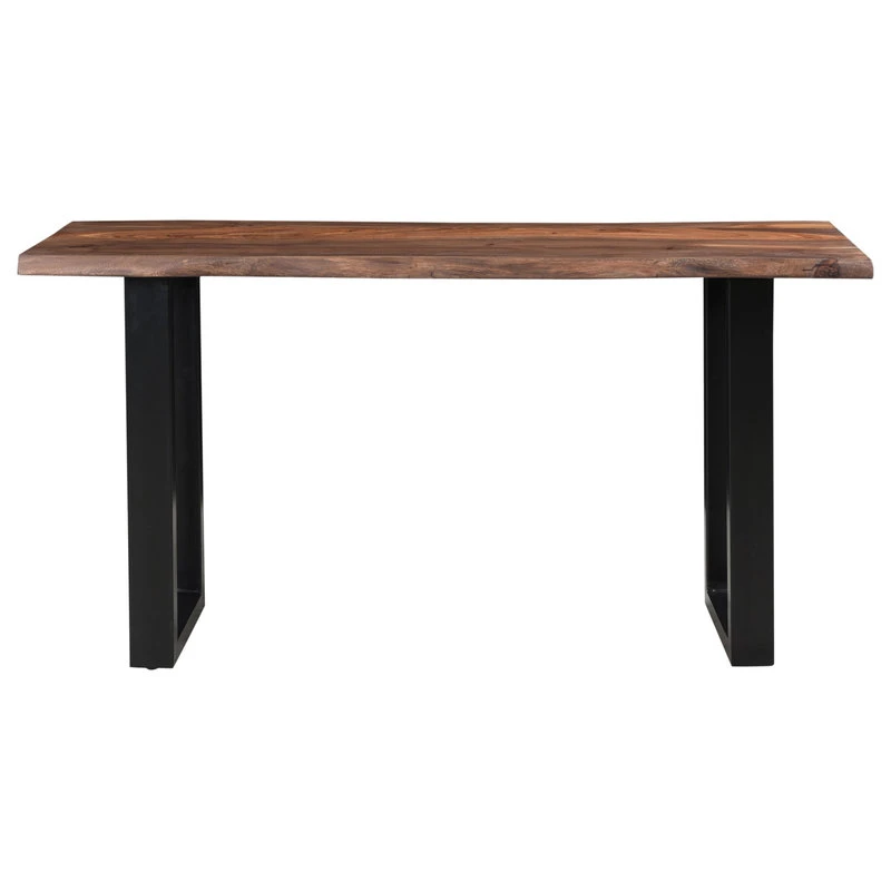 In your kitchen, den or foyer, this stunning Console Table will bring that wonderful natural component to your decor. Dark powder coated metal legs hold aloft a stunning piece of Sheesham wood, rich in the exotic graining that flows from end to end and gleaming in the Brownstone Nut Brown finish. Live edges have gentle curves, and being a natural element, no two will ever be alike. Beautiful anywhere you choose to put it, but especially nice when used with the matching Cocktail and End Tables.