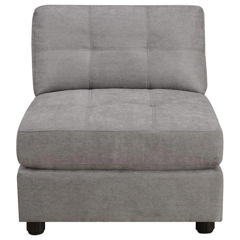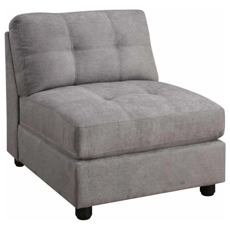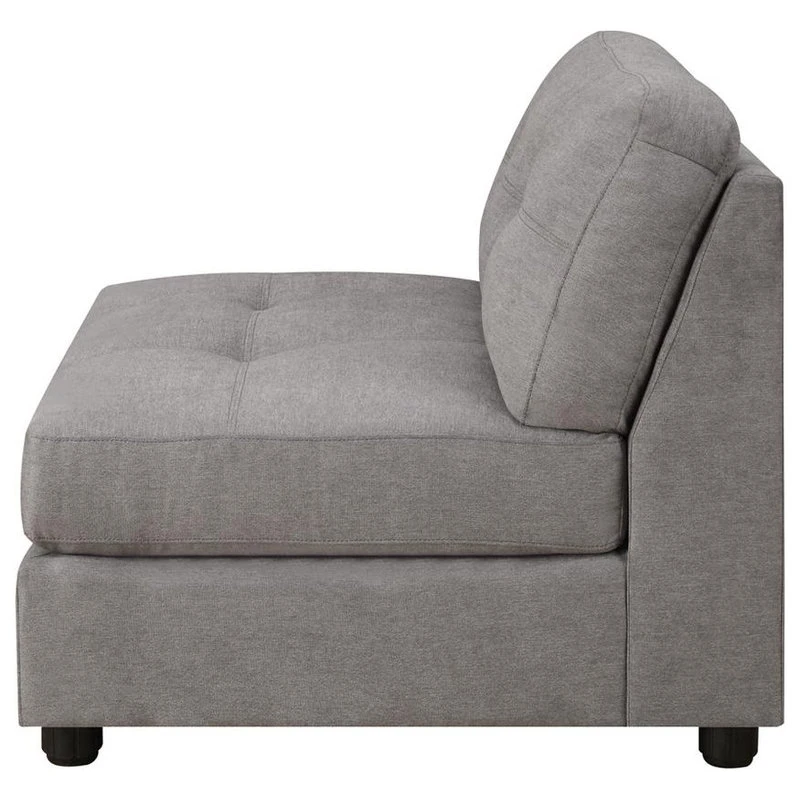 This armless chair, part of the Claude Collection of sectional furniture, can be fit into any room size that works best in your home. Upholstered in a dove grey thick-padded microfiber seating, this chair features tufted seat and back. Kiln-dried hardwood frame provides a sturdy base for this modular piece. Complete the Claude sectional piece with this armless chair.
