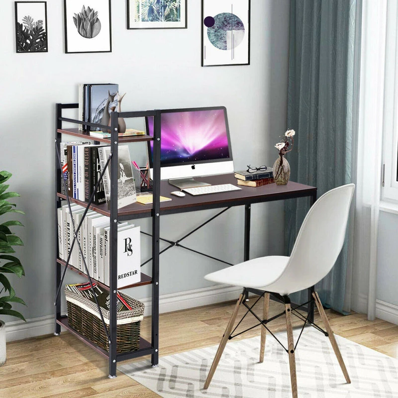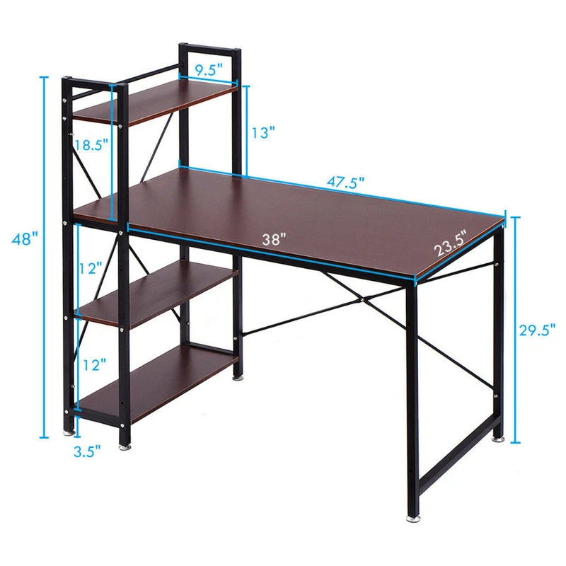 With compact design and 4-tier equipped shelf, this computer desk creates super large storage with less space occupying. Combined with two-side X-shape frame, there will be no worry about the table stability. As the material we use is of P2 grade, you may rest assured about your health for there is less harmful substance. The height of table leg is adjustable, which ensure greater practicality to use on all kinds of ground.
