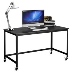 This simplistic style computer desk is a perfect furniture to fit your home or office. With its large full-size workstation, this desk provides you a unmatched convenience for your work. Featuring high-quality Particleboard and powder-coated steel pipe, this computer desk is sturdy and anti-corrosion and provides years of sturdy and reliable use. Moreover, it has 4 universal wheels, which makes it easy to move. All of the wheels are lockable.
