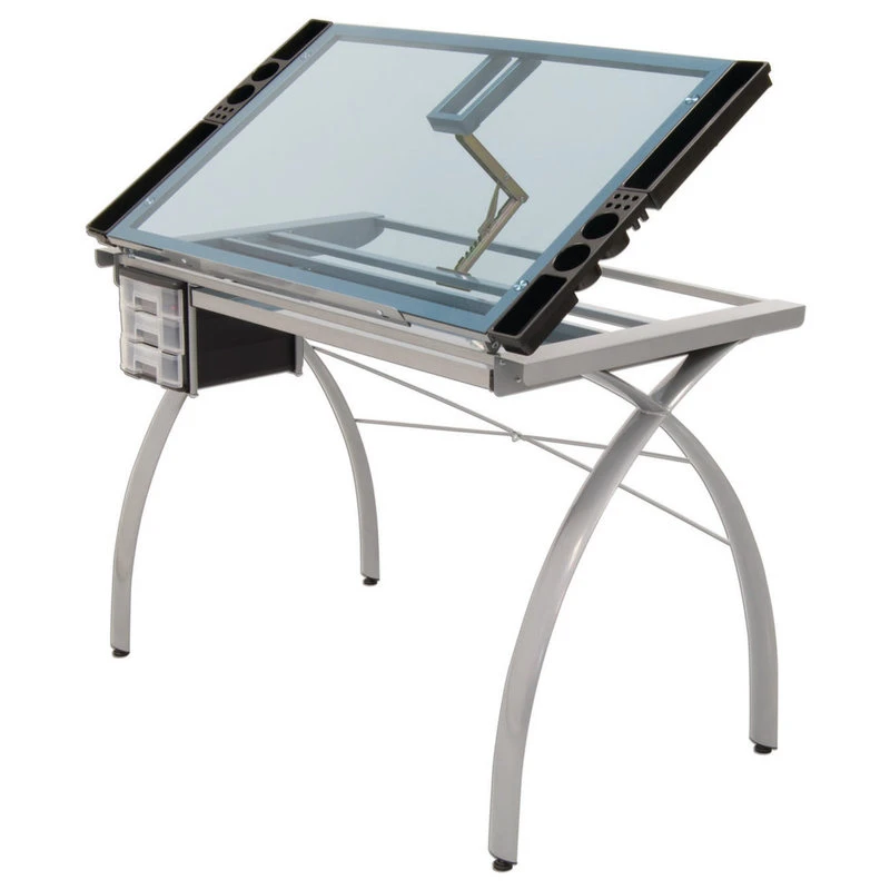 The perfect multi-functional contemporary table: Craft Accents Futura Craft Station is great for drafting, drawing, or crafting on its large tempered safety-glass work surface. The table top angle adjusts up to 35 degrees. Features include a large pencil drawer, 4 removable side trays for supplies, and 3 slide-out drawers for additional storage (mounts on either side of the table). A 24″ pencil ledge slides up and locks into place if you’d rather keep pens, pencils, or brushes on the table top. Constructed of heavy gauge, powder-coated steel for durability and 4 floor levelers for stability. Available styles: Silver/Blue Glass, Black/Black, Black/White, Black/Clear Glass. Main work surface: 38″ W x 24″ D. Pencil drawer Dimensions: 28″ W x 9.5″ D. Overall Dimensions: 43.25″ W x 24″ D x 31.5″ H. (Additional item accessory sold separately: Futura Leg Extensions in Silver #10051 and Black #10073)
