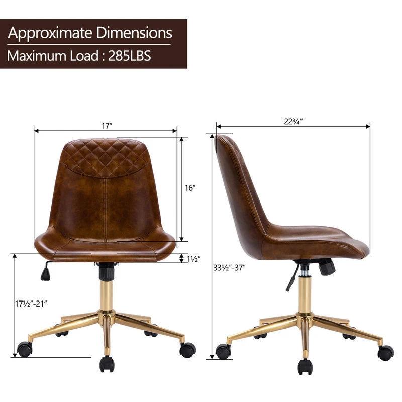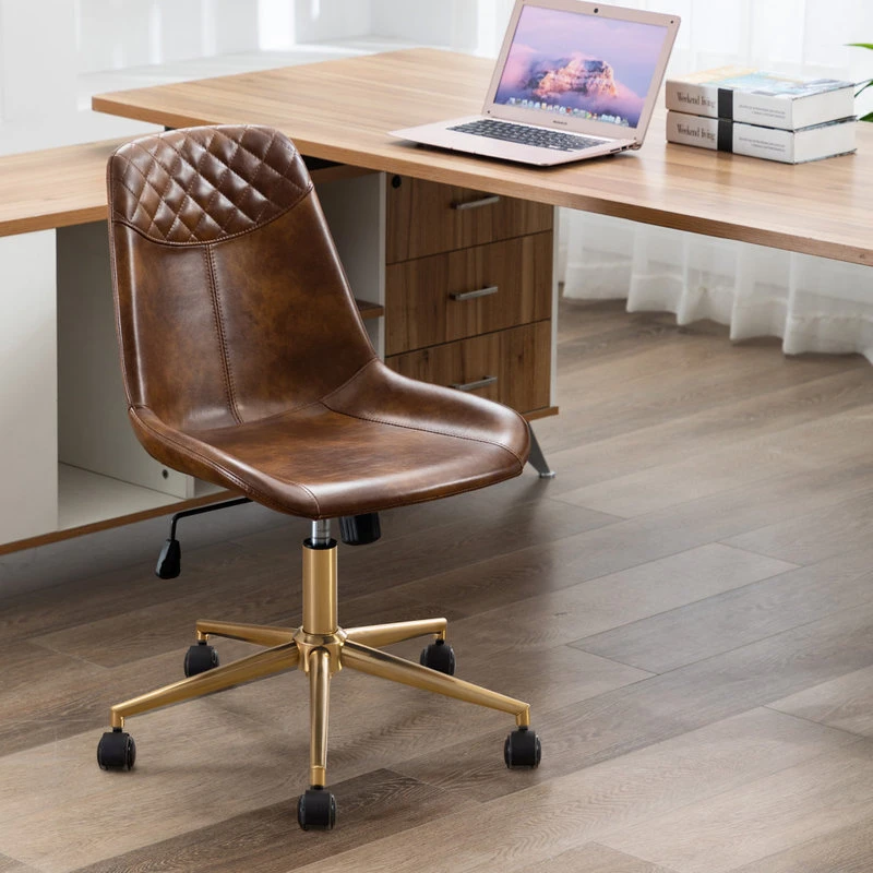 Show off the prestige of your workspace with our Faux Leather Gold Base Desk Chair. Perched on a golden-finished base, our decent faux leather desk chair sets the tone of your room with a hint of upscale deluxe feel. Also, the armless desk chair never fails to impress with rhombic and linear stitches, either on the back or seat.