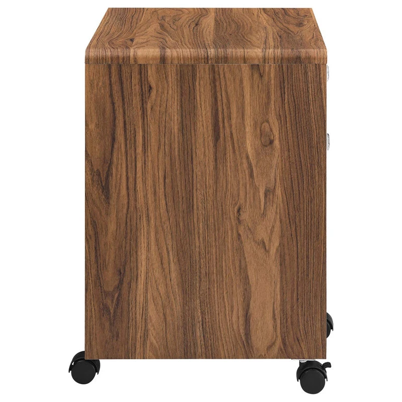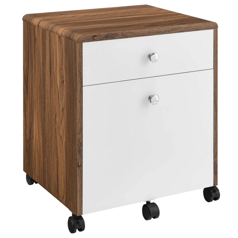 Challenge uniformity with the Leyster Filing Cabinet. This rolling file cabinet features a durable particleboard and MDF frame with a walnut wood grain laminate, white drawer fronts, and metal hardware. Resting on four plastic casters for easy maneuverability, this office cabinet effortlessly glides underneath an L-shaped desk but also offers practical functionality as a stand-alone piece in your workspace. This file cabinet is complete with a spacious upper drawer for storing office essentials and a deep lower drawer designed for filing system organization. Weight Capacity: 200 lbs.