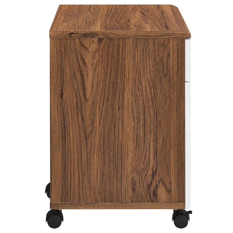 Elevate your office decor with the Somerset Filing Cabinet. This rolling file cabinet features a durable particleboard and MDF frame with a walnut wood grain laminate and white laminate drawer fronts. Resting on four plastic casters for easy maneuverability, this office cabinet effortlessly glides underneath an L-shaped desk but also offers practical functionality as a stand-alone piece in your workspace. This file cabinet is complete with a spacious upper drawer for storing office essentials and a deep lower drawer designed for filing system organization. Weight Capacity: 200 lbs.