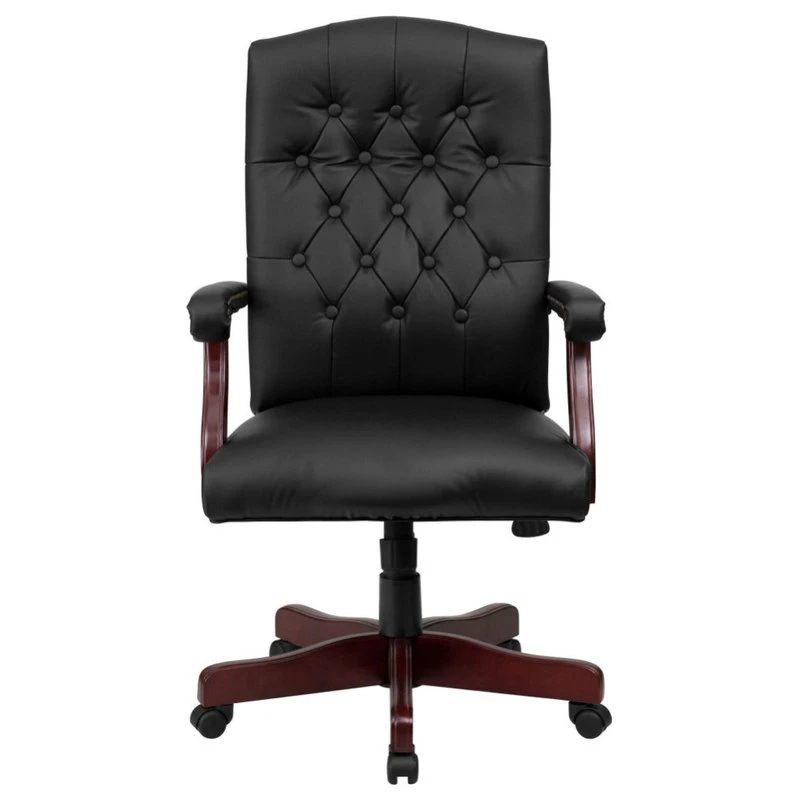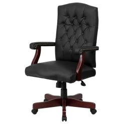 This luxurious traditional chair is available in a Black Leather upholstery. Chair easily swivels 360 degrees to get the maximum use of your workspace without strain. The pneumatic adjustment lever will allow you to easily adjust the seat to your desired height. The arms are adorned in classic brass nail trimming. Ergonomically designed for a healthy way to work this chair will provide you with ample comfort, in the office or at home. (801L-LF0005-BK-LEA-GG)