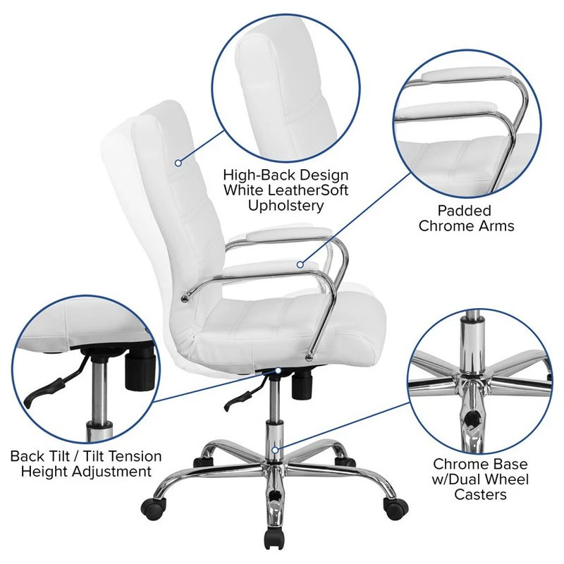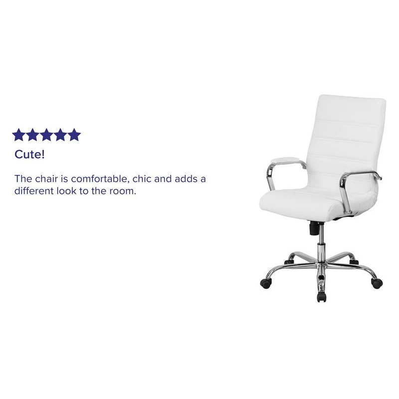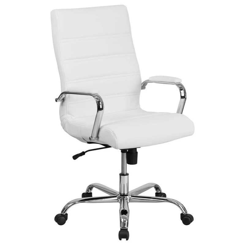 An elegant blend of comfort and style, this high-back LeatherSoft office chair is the perfect seating solution for your workspace. Crafted from white LeatherSoft material with chrome arms and a chrome base, the ergonomic design brings a sleek look with ample durability and support for long-term use. Designed for exceptional comfort, this LeatherSoft office chair features a cushioned seat and back upholstered in white LeatherSoft for softness and durability. Padding on the arms lends additional comfort, while horizontal stitching along the seat and back adds a touch of refinement. The high-back office chair features extended height to support your upper back and help relieve back tension. A waterfall front seat edge removes pressure on your lower legs, to help improve circulation during long hours at your desk. Complete your custom fit with the pneumatic seat height adjustment lever and a tilt-lock mechanism for a rocking and reclining motion. Easily maneuver through a variety of tasks with the full 360-degree swivel chair motion that is ideal for shifting between your computer, phone, and more. When you need to reach things a little further away, simply roll your chair with the smooth movement of the wheeled base. A bright chrome finish adorns the frame and arms of this office desk chair, creating a sleek and timeless look. The classic white LeatherSoft pairs effortlessly with any office decor style, creating a comfortable and elegant impression that’s perfect for residential or corporate workspaces.