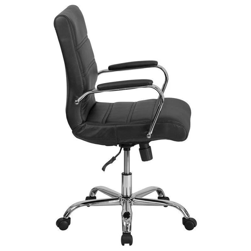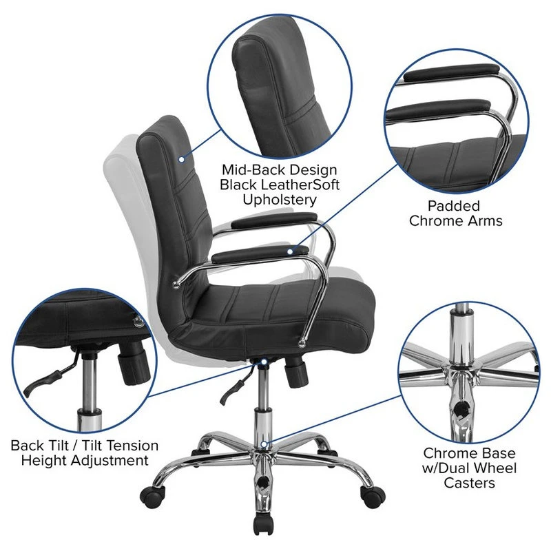 Toss out that old and boring office chair that you’ve had for years, because it’s time for an upgrade with this sleek mid-back leather office chair. No longer used in just offices, you are seeing office chairs used in nail salons, car shops, and stores to help busy workers achieve maximum comfort while performing their work duties. Upholstered in soft and durable LeatherSoft upholstery and paired with chrome finishing help construct this modern office chair. Designed with your comfort in mind, this ergonomic desk chair features ample padding to get you through an 8-hour workday or be your seating of choice to furnish your conference room. With its adjustable features you can lean back while you take a quick phone call or lock in an upright position when it’s time to focus. The knob located underneath the seat adjusts the force needed to recline. Improve the look at your desk or work area with this stylish mid-back black LeatherSoft office chair with chrome base that is highlighted by attractive horizontal line stitching. A waterfall front edge seat reduces pressure off your legs while the armrest pads relieve the pressure off your necks and help round out the look and comfort of this chair.