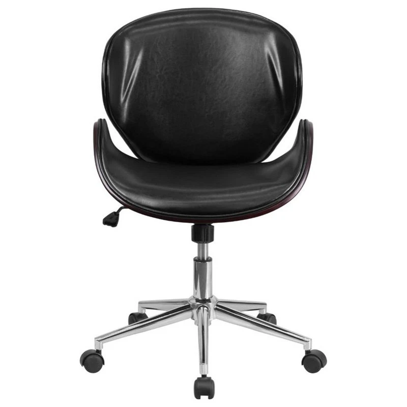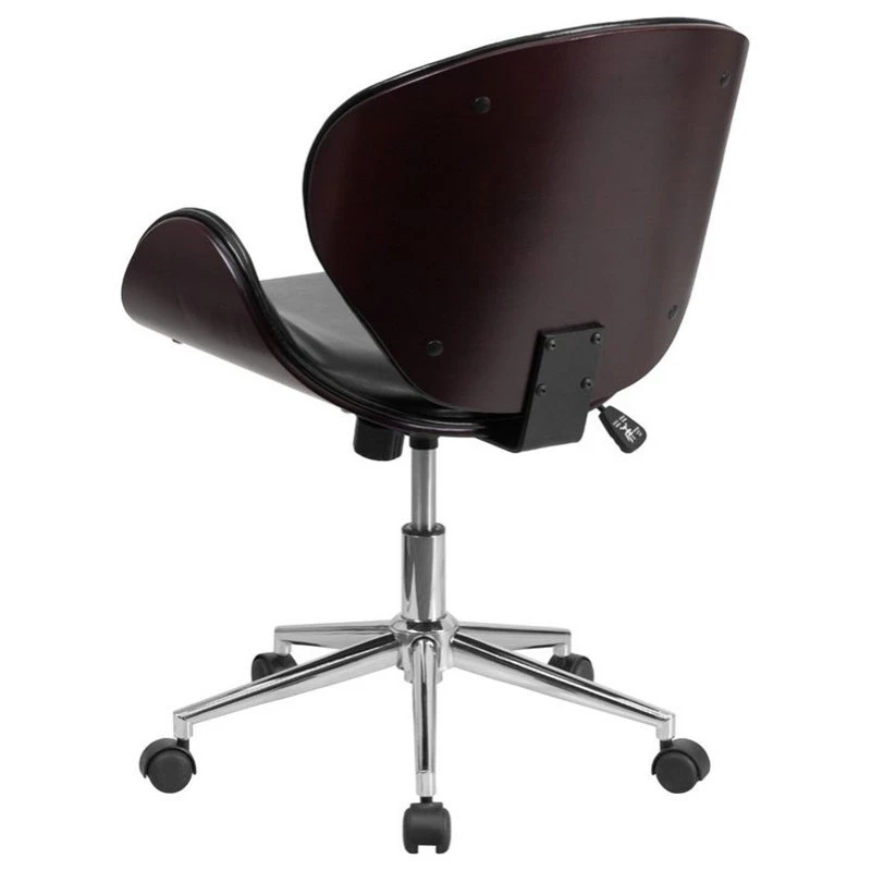 This office chair features a beautiful mahogany bentwood frame with glossy black leather upholstery. This chair is sure to make an impression and become the focal point in your office or home office. A mid-back office chair offers support to the mid-to-upper back region. The contoured backrest provides firm back support. Chair easily swivels 360 degrees to get the maximum use of your workspace without strain. The pneumatic adjustment lever will allow you to easily adjust the seat to your desired height.