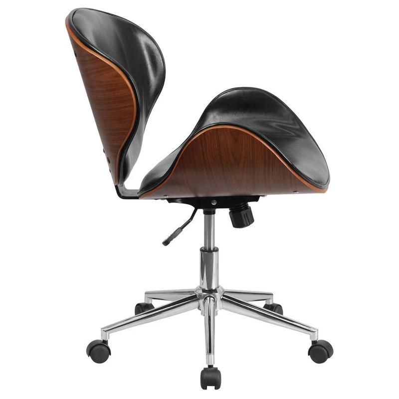 This office chair features a beautiful walnut bentwood frame with glossy black leather upholstery. This chair is sure to make an impression and become the focal point in your office or home office. A mid-back office chair offers support to the mid-to-upper back region. The contoured backrest provides firm back support. Chair easily swivels 360 degrees to get the maximum use of your workspace without strain. The pneumatic adjustment lever will allow you to easily adjust the seat to your desired height.