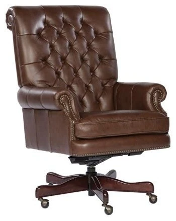 With a trendy and sophisticated feel and comfortable, ergonomic design, this Coffee Leather Executive Chair by Hekman is a must have for any workplace. Made with beautiful genuine leather, the chair comes with a tufted back, antique brass nailhead trim and five-point wood base with casters. For your comfort throughout the day, there is pneumatic lift mechanism and knee-tilt mechanism.