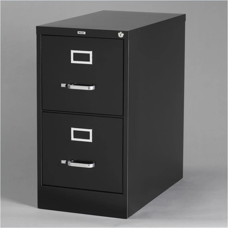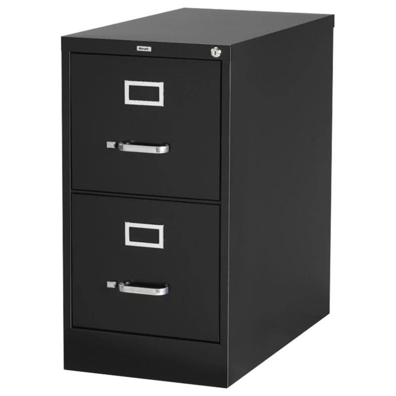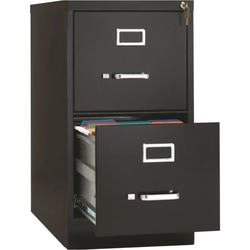 26.5-inch deep two-drawer, letter width, commercial grade black vertical file cabinets are perfect for business, educational, or personal offices. These cabinets feature a classic design and are constructed with high quality durable materials that are suitable for heavy-duty use. Ships fully assembled and is ready to accept letter width hanging file folders. Non-porous surface is easy to clean and disinfect. Each drawer includes full extension ball-bearing slides for smooth drawer action. Even fully loaded, these drawers open with ease. Adjustable follower blocks keep files upright. The aluminum handles and label holder are durable and functional making it easy to access and label drawer contents. The included core-removable lock allows cabinets to be keyed alike. Designed to meet or exceed ANSI/BIFMA industry standards for performance and workmanship. Made with 28% total recycled content. Backed by a Limited Lifetime Warranty. TAA Compliant. Greenguard Gold certified for indoor air quality.