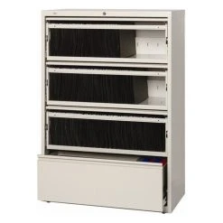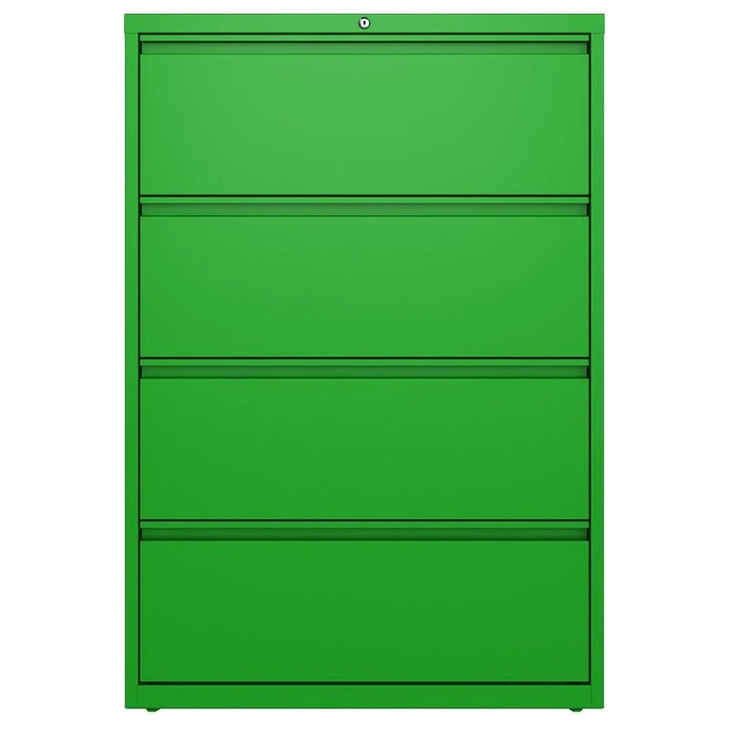 This 36 in. wide 4 drawer metal commercial grade lateral filing cabinet in screamin’ green is designed for heavy duty use, yet looks great in any office. Precision ball-bearing suspension allows for quiet use in your busy office environment. Fully assembled steel construction with reinforced base. Non-porous surface is easy to clean and disinfect. Interlock system prevents tipping by only allowing one drawer open at a time. Dual lock bars and core-removable lock come standard. Unit includes hang rails, magnetic label holders, and four adjustable leveling glides. Greenguard Gold certified for indoor air quality. Meets or exceeds ANSI/BIFMA standards. TAA compliant. Limited Lifetime Warranty.