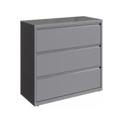 This 42 in. wide 3 drawer metal commercial grade lateral filing cabinet in arctic silver is designed for heavy duty use, yet looks great in any office. Precision ball-bearing suspension allows for quiet use in your busy office environment. Fully assembled steel construction with reinforced base. Non-porous surface is easy to clean and disinfect. Interlock system prevents tipping by only allowing one drawer open at a time. Dual lock bars and core-removable lock come standard. Unit includes hang rails, magnetic label holders, and four adjustable leveling glides. Greenguard Gold certified for indoor air quality. Meets or exceeds ANSI/BIFMA standards. TAA compliant. Limited Lifetime Warranty.