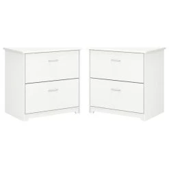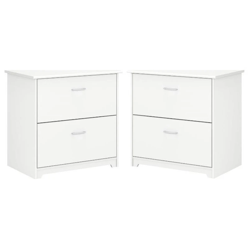 - 2 Drawer Lateral File Cabinet in White – Engineered WoodThe Bush Furniture Cabot 2 Drawer Lateral File Cabinet is a great way to keep important documents organized in your home office. Featuring a timeless traditional style, this filing cabinet features two spacious drawers that accept letter size paperwork. Both drawers open on smooth full-extension ball bearing slides for an easy reach to contents all the way at the back. The 2 Drawer File Cabinet can also be used with the coordinating Cabot Corner Desk or L Shaped Desk (sold separately) to create an extended work surface when placed side by side. Each drawer is fitted with stylish Chrome-finished handles that complement your choice of four attractive finishes to complete the simple, elegant appearance. This lateral filing cabinet is tested to meet ANSI/SOHO standards for safety and performance. See the full collection for coordinating items, all backed by a 1 Year Warranty. Materials: Engineered wood and durable laminates