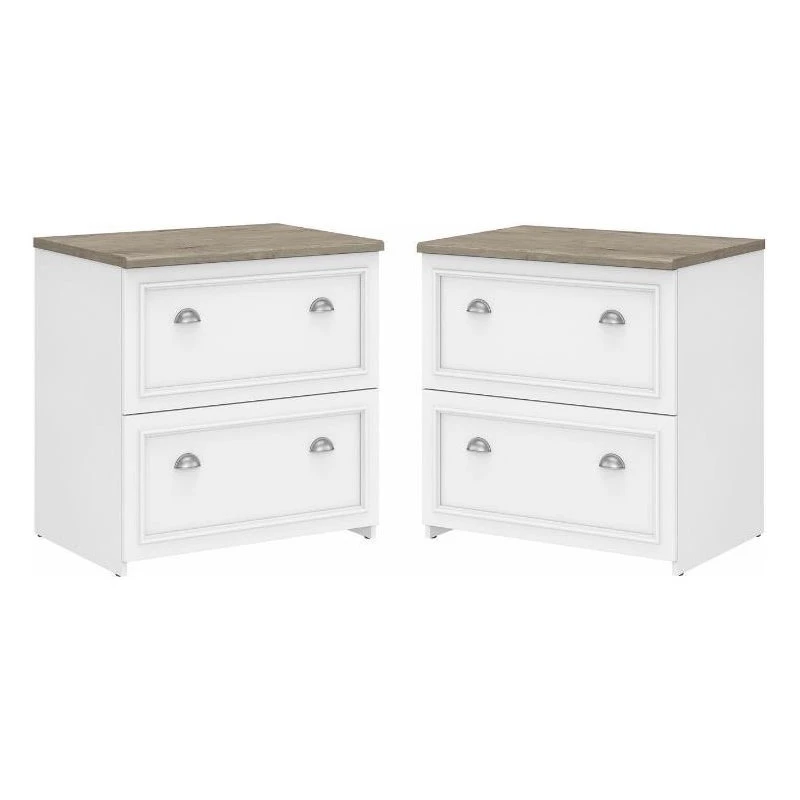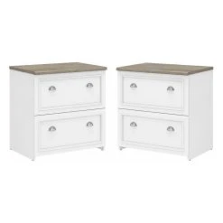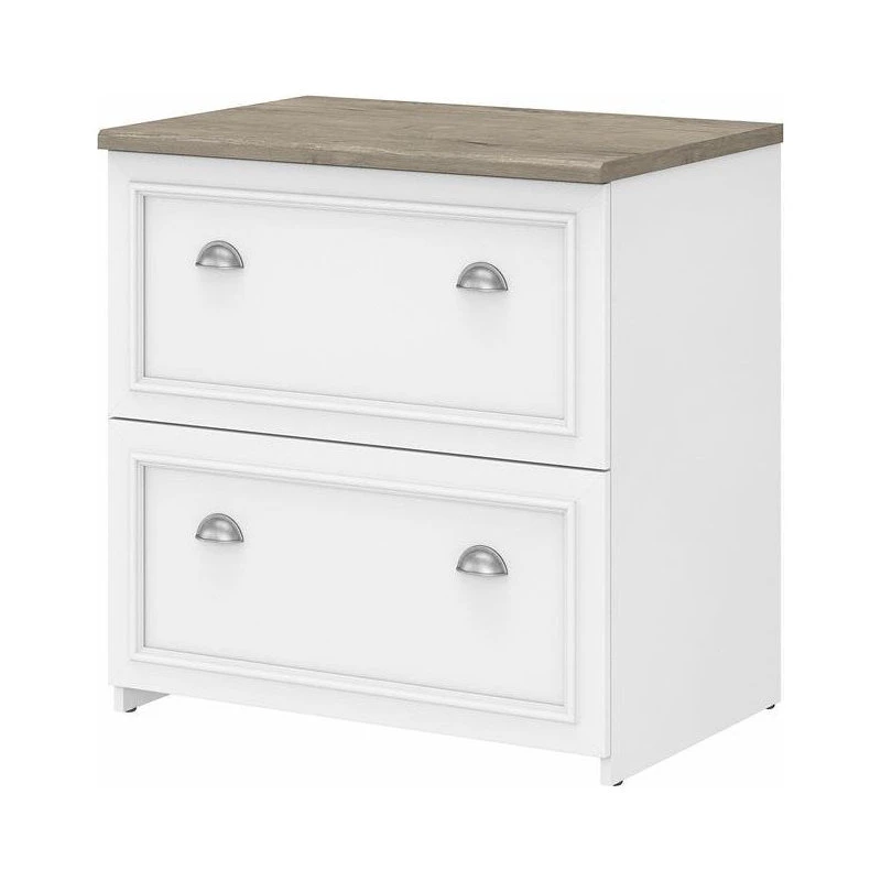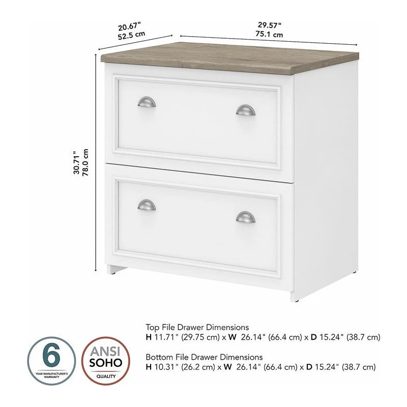 - 2 Drawer Lateral File Cabinet in White and Gray – Engineered WoodBring a slice of modern farmhouse styling into your home office and get organized with the Bush Furniture Fairview 2 Drawer Lateral File Cabinet. Two large file drawers open on smooth full-extension ball bearing slides for an effortless reach to all your paperwork. The filing cabinet’s drawers accommodate letter, legal and A4-size documents and hold up to 50 pounds of materials each. Measuring 30W x 20D x 30H, the 2 Drawer File Cabinet matches the height of the coordinating Fairview L Shaped Desk with Storage (sold separately) to offer an extended work surface when placed side by side. This farmhouse File Cabinet is tested to meet ANSI/SOHO quality standards for safety and performance and is backed by the Bush Furniture 6 Year Manufacturer’s Warranty. See the full Fairview Collection for coordinating items to complete your work or living space with relaxed cottage styling. Materials: Engineered Wood and Laminates