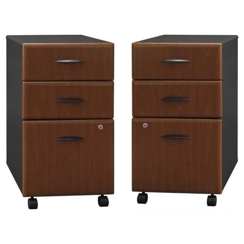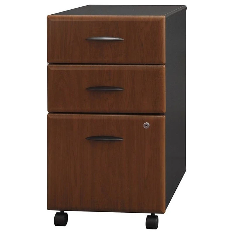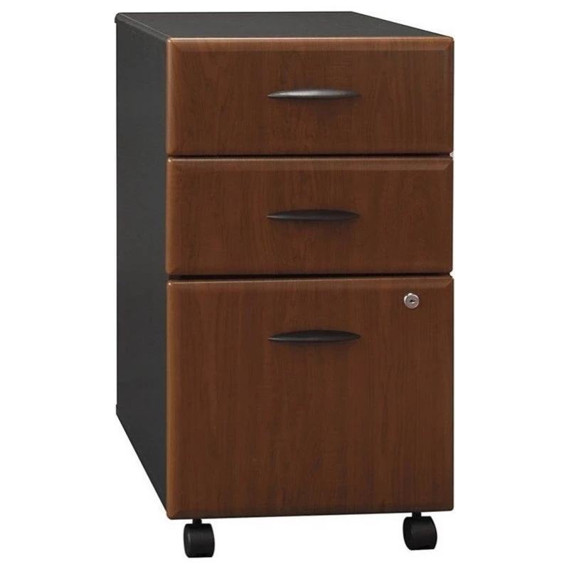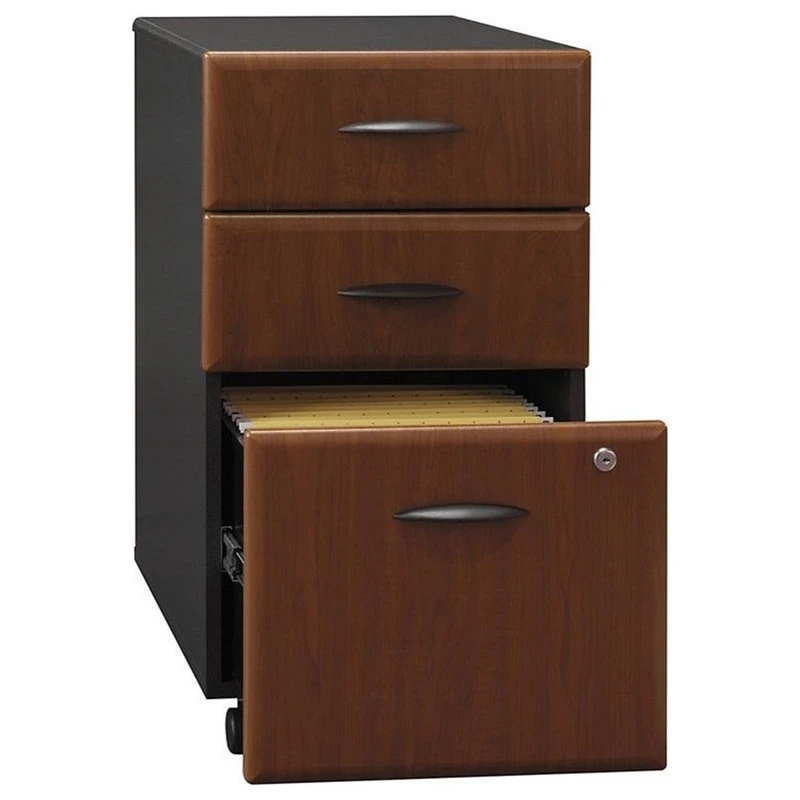 - 3 Drawer Mobile File Cabinet in Hansen Cherry – Engineered WoodCreate more storage space with the affordable and functional Bush Business Furniture Series A 3 Drawer Mobile File Cabinet. With a file drawer gliding on smooth full-extension ball bearing slides, the Cabinet provides effortless access to letter, legal and A4-sized documents. 2 box drawers keep office supplies at your fingertips. Slide the Mobile File Cabinet under your Series A Desk to minimize your office footprint, or roll it wherever you need it most. Dual-wheeled, hooded casters ensure easy movement, while a single lock secures the lower 2 drawers for your privacy. The sturdy construction resists scratches, stains and dents for long-lasting quality. Series A offers a variety of layout options and 7 attractive two-tone finishes. Backed by a 10 Year Warranty. American made with U.S. and imported parts.
