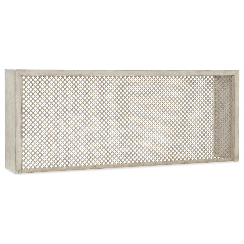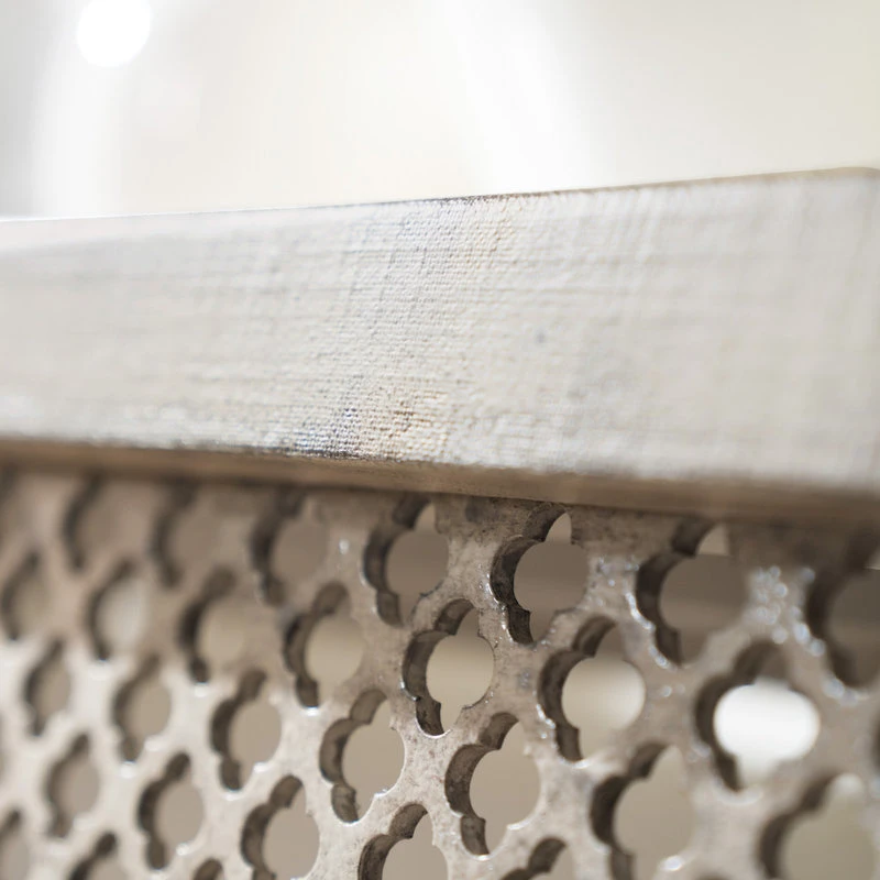 Inspired by the Belgian design aesthetic, this distinctively designed console combines a perforated wood grill pattern on the front with the tactile Grain Sack finish, plaster applied over distressed linen to give the authentic look of a plaster wall. Crafted of Poplar and Hardwood Solids with linen.