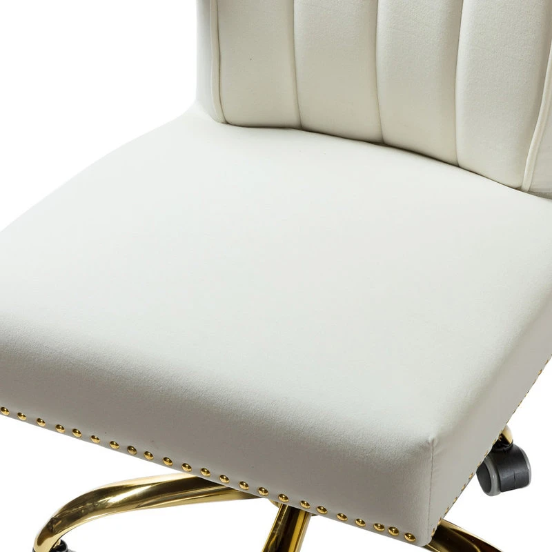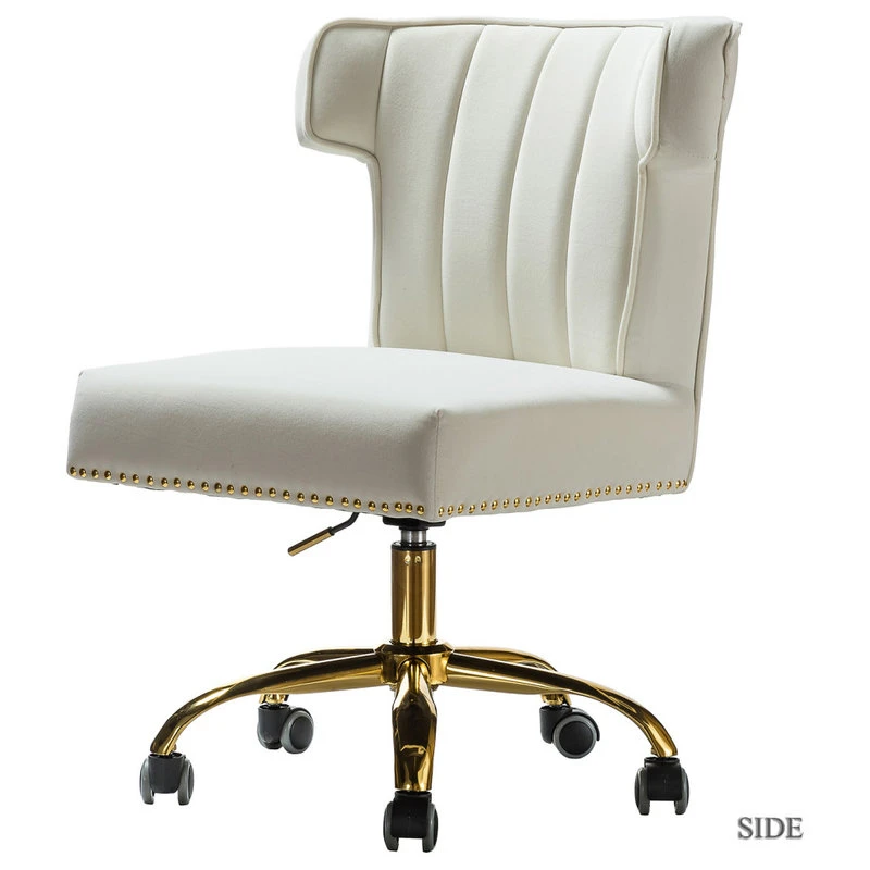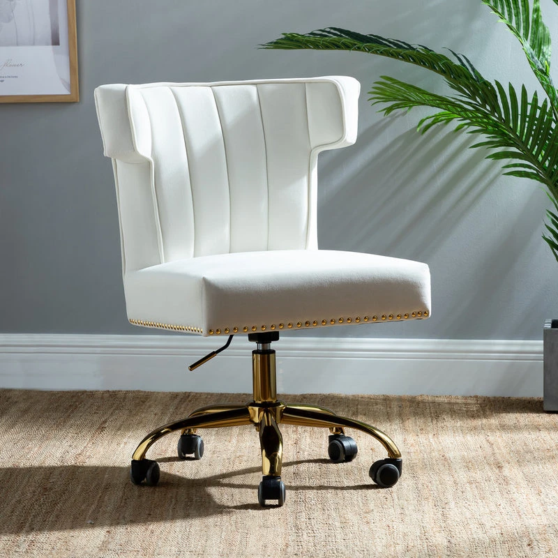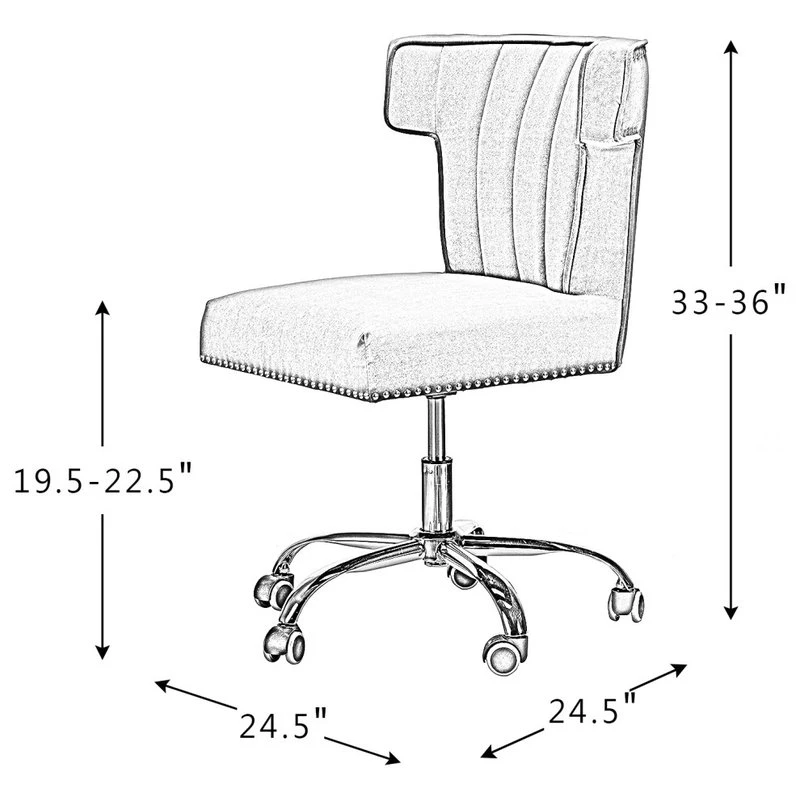 A well-edited workspace calls for a carefully-curated chair C and this design is it! It offers supreme comfort thanks to its ergonomic shape and features a durable frame with soft filling. The bright and colorful finish will blend with most color palettes. Its classic design along with wingback and gleaming nailhead trim makes this chair a must-have in your home office. Durable gold finish metal five-pronged base and high performance all directional wheels allow smooth movement across carpeting. This chic design is height-adjustable to personally tailor your space.
