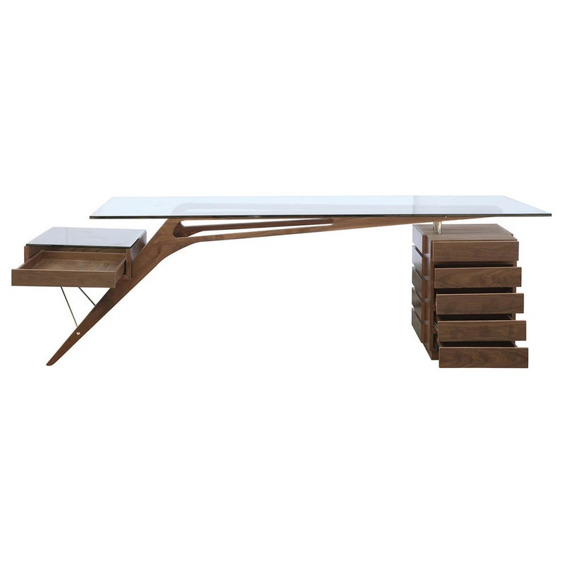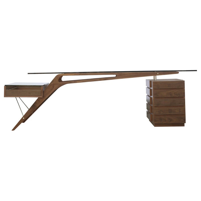 A study of the architectural elements comprising the structure of the Protractor Desk brings full appreciation for the modernist masterpiece. A chair would slide beneath two boomerang Solid Ash support beams. At the point where vertical transforms to horizontal, rounded oblong shapes have been cut out of the beams creating a transparent airy illusion. Resting on raised stainless steel support buttons, A 15mm thick tempered glass plate provides an elegant writing surface for Protractor. Stainless steel bolt sleeves float the wooden beams off the surface of the slatted cube of 5 drawers. On the opposite side, total transparency is achieved with an open faced single pull out drawer covered by a 15mm glass panel. Two steel rods extend from the boomerang beams, supporting the outer edge of the transparent drawer. A design marvel exceptionally reproduced and coated with a brilliant lustrous finish.