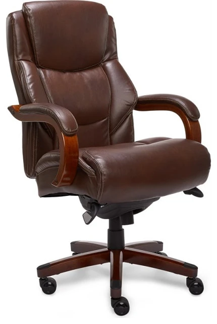 Bring premium comfort and support to your home or office with the La-Z-Boy Delano Big & Tall Executive Office Chair. Upholstered in soft bonded chestnut brown leather with hand-sculpted real wood arms and base, this swivel chair offers an elegant blend of traditional style and modern performance that enhance any office, home, or entertainment space. A big and tall design ensures you have ample room at your desk, while a contoured back lumbar panel and advanced memory foam cushion layering system deliver comfort and support in the areas you need it most. Ergonomic and adjustable, this high back office chair allows you to control the height, tilt, and lift to suit your sitting position, providing optimized body alignment to ensure you remain comfortable and properly supported while sitting for long periods.