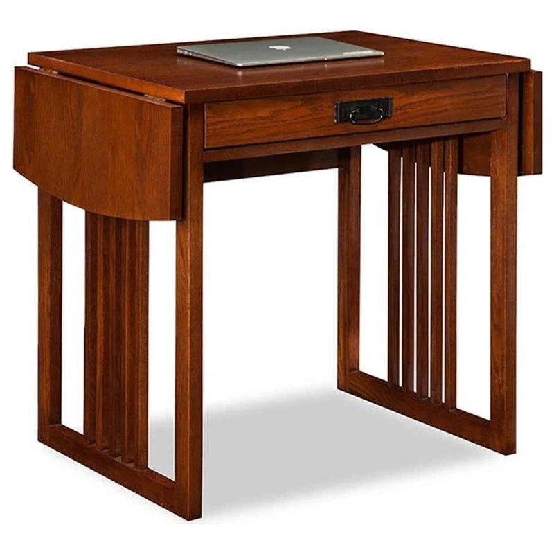 Perfect for laptops or to hide away papers or a desktop keyboard, this delicately scaled chocolate desk offers abundant organization assistance in just a tiny space. The drop down front presents the keyboard at a comfortable work height while full extension drawer guides offer the full depth of the drawer as useable space. Drop leaves are at the ready to extend for extra work surface when you need it.