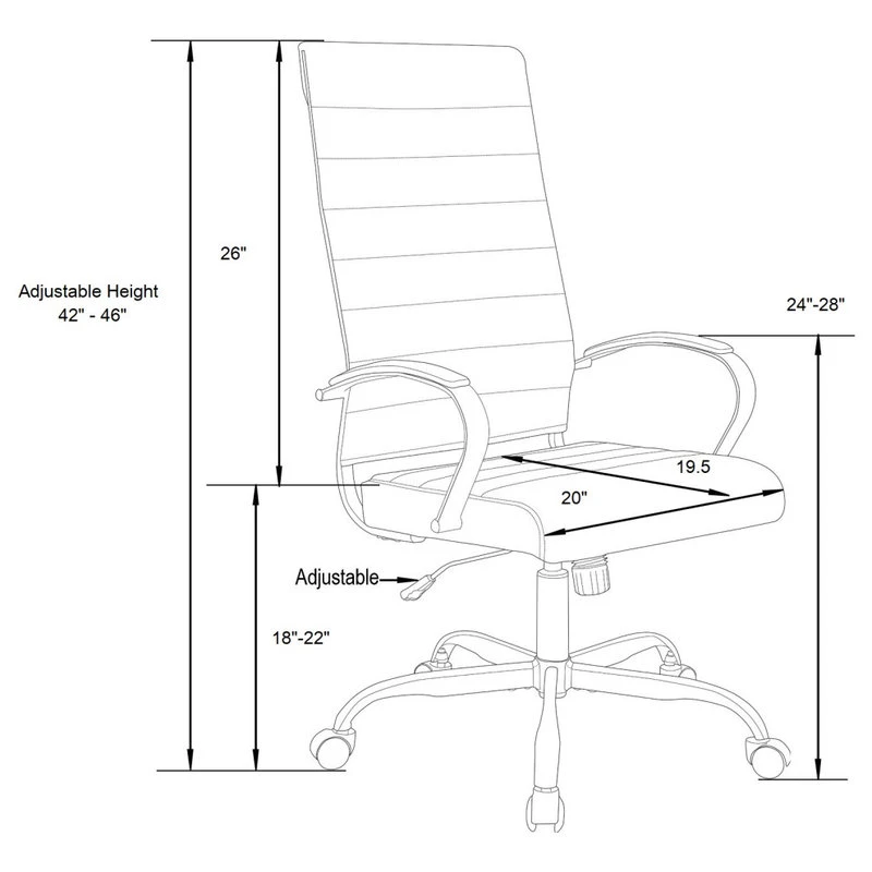 Embrace full luxury with this exceptional Benmar office chair built to provide optimal comfort and a sophisticated aesthetic. Make a statement with an adjustable mid-century style chair that completes the contemporary office space. Inspired by a classic mid-century design, this version shows off a bold and sophisticated presence. High back office chairs have backs extending to the upper back for greater support. With a pneumatic gas lift to adjust the seat height and 360-degree swivel, this chair delivers the versatility and functionality required by the modern working environment. A tension knob and tilt locking lever complement a catered five-point base for easy mobility.