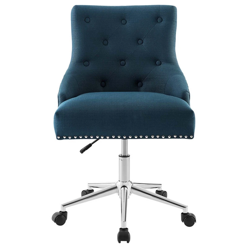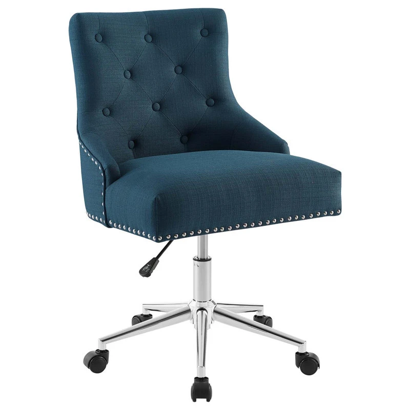 Introduce vintage flair and elegant appeal with the Regent Button Tufted Upholstered Fabric Swivel Office Chair. Metal nailhead trim and tufted buttons provide visual depth, while a luxuriously padded upholstered fabric back and seat for exceptional support to this superbly constructed computer desk chair. A polished chrome base and five dual-wheel nylon casters provide easy movement over hardwood or carpeted surfaces while a full 360-degree swivel and pneumatic height adjustment create a custom seating experience for optimal performance. Perfect for the modern home or office, this upholstered fabric office chair is a desirable addition to any workspace. Chair Weight Capacity: 287 lbs.
