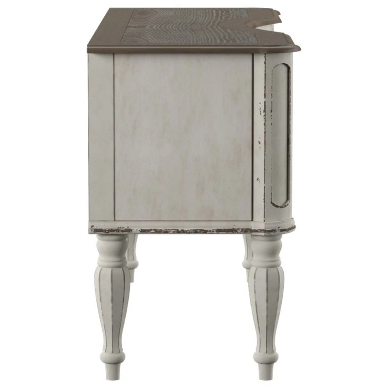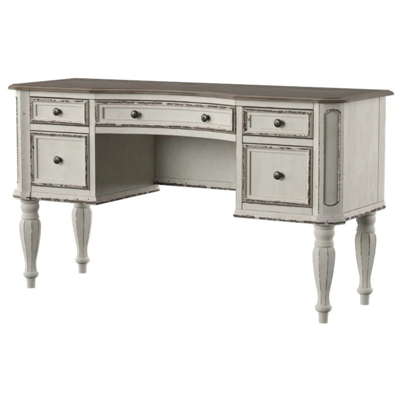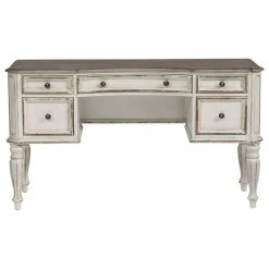 Start your mornings off by utilizing this charming vanity desk. The weathered brown whitewash top paired with the antique white finish and antique pewter knob hardware creates a truly unique look. Five full extension fully stained drawers allow you to store all your accessories, with two dividers located in the side drawers to help with organization. This unique piece is the perfect finish touch to any space.