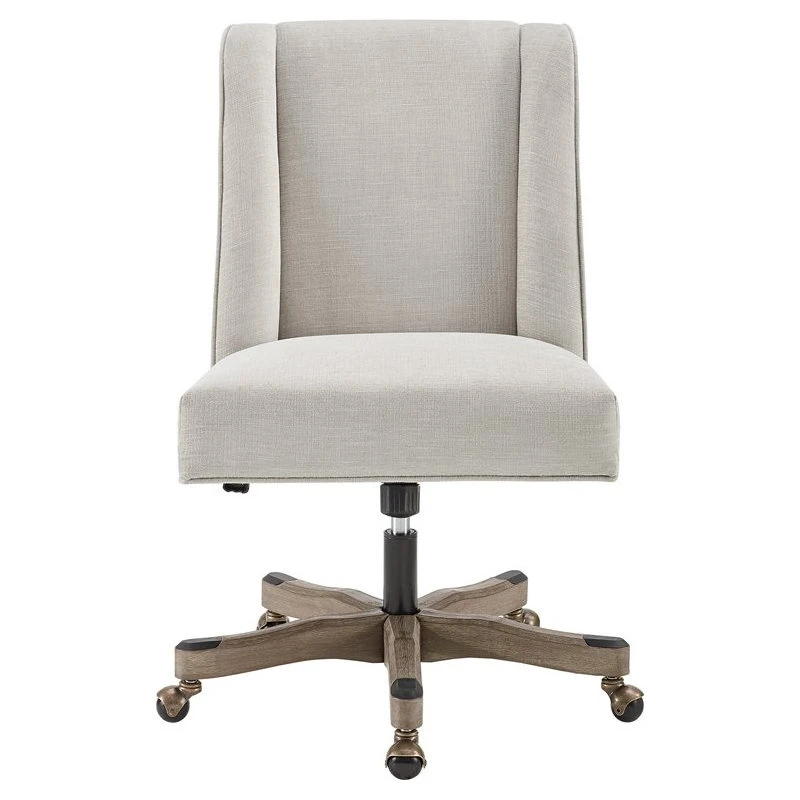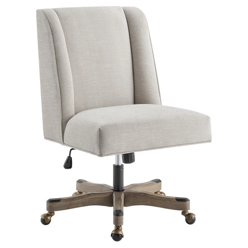 Add style and function to your office or dining with the Draper Office Chair. The soft, plush frame features simple, modern lines upholstered in a natural linen finish fabric with tailored welting. A sturdy gray wash wood base is set upon durable metal casters for easy mobility. An adjustable seat height ensures this chair works for a variety of table heights. Perfect for a home workspace or a formal dining area, it is sure to add style and comfortable seating.
