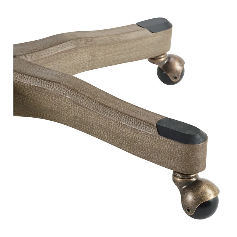 - Grey wash wood base with protective cap and antique brass colored metal casters