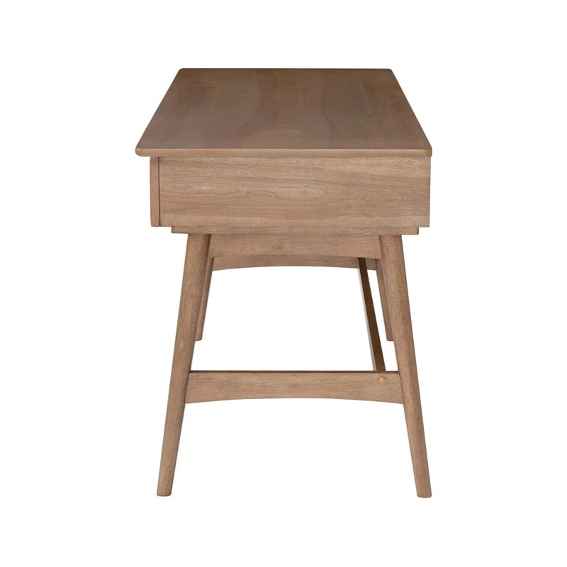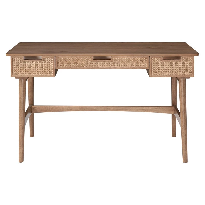 Escape the stuffiness of corporate office decor and bring new life into your home workspace with this mid century inspired rattan desk. The top, side and back panels glow in a natural birch veneer and are complimented by 3 handwoven rattan drawer fronts with cutout handles. The base is made of solid wood and outfitted with glides on its feet to protect hardwood floors. There’s no need for productivity and style to be mutually exclusive in your study, bedroom or living room with this timeless piece.