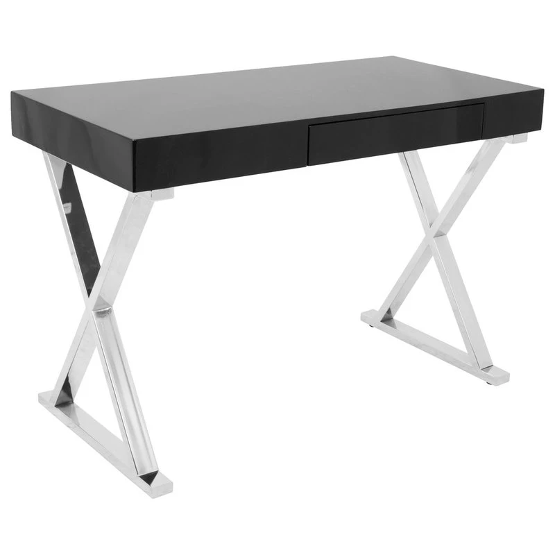 The Luster Contemporary Office Desk will bring a no-frills, minimalist feel to your workspace. The sleek desk features a wide working surface, as well as a spacious pull-out drawer. With its gloss-finished top and X-shaped legs in a chrome finish, this desk is sure to bring an updated look to your home office.